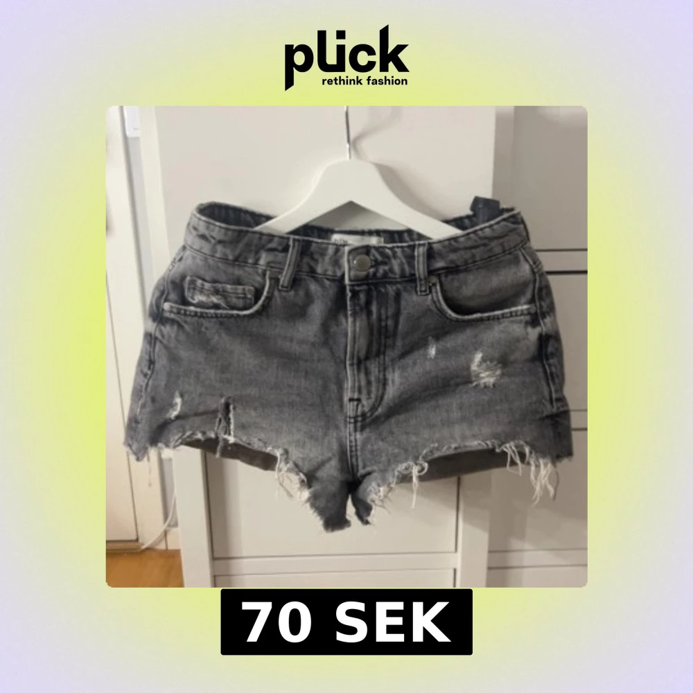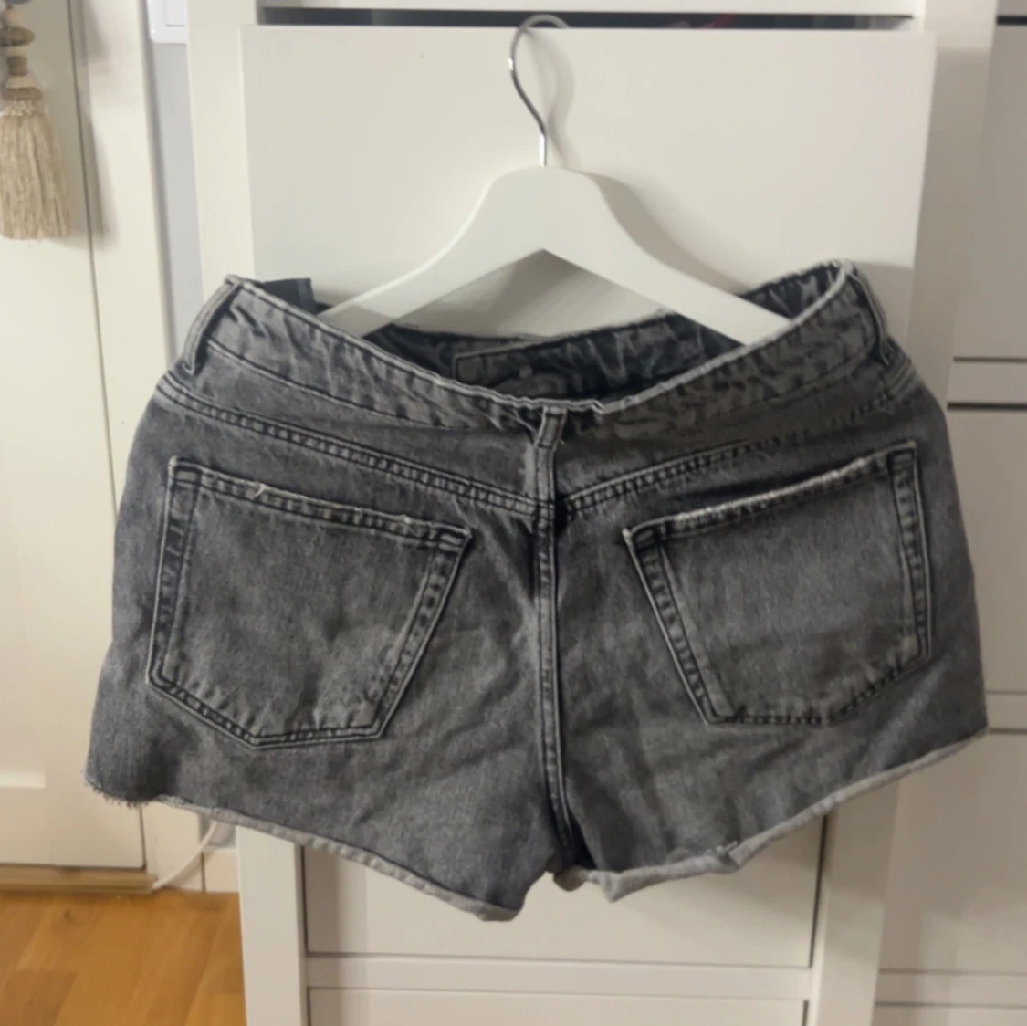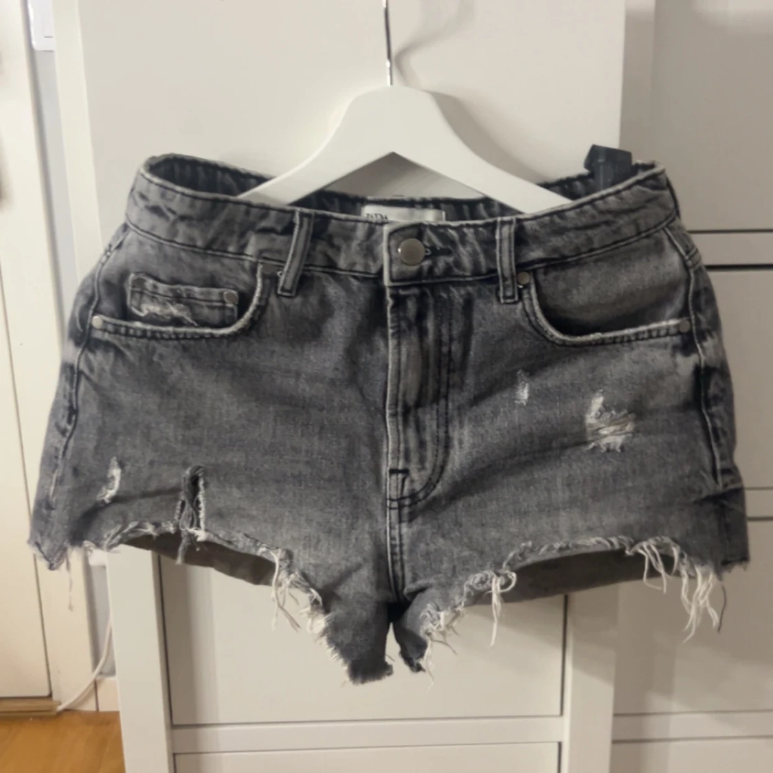 Säljer ett par grå jeansshorts från zara med råa kanter och slitna detaljer framtill. Klassisk femficksmodell med knapp och dragkedja.
