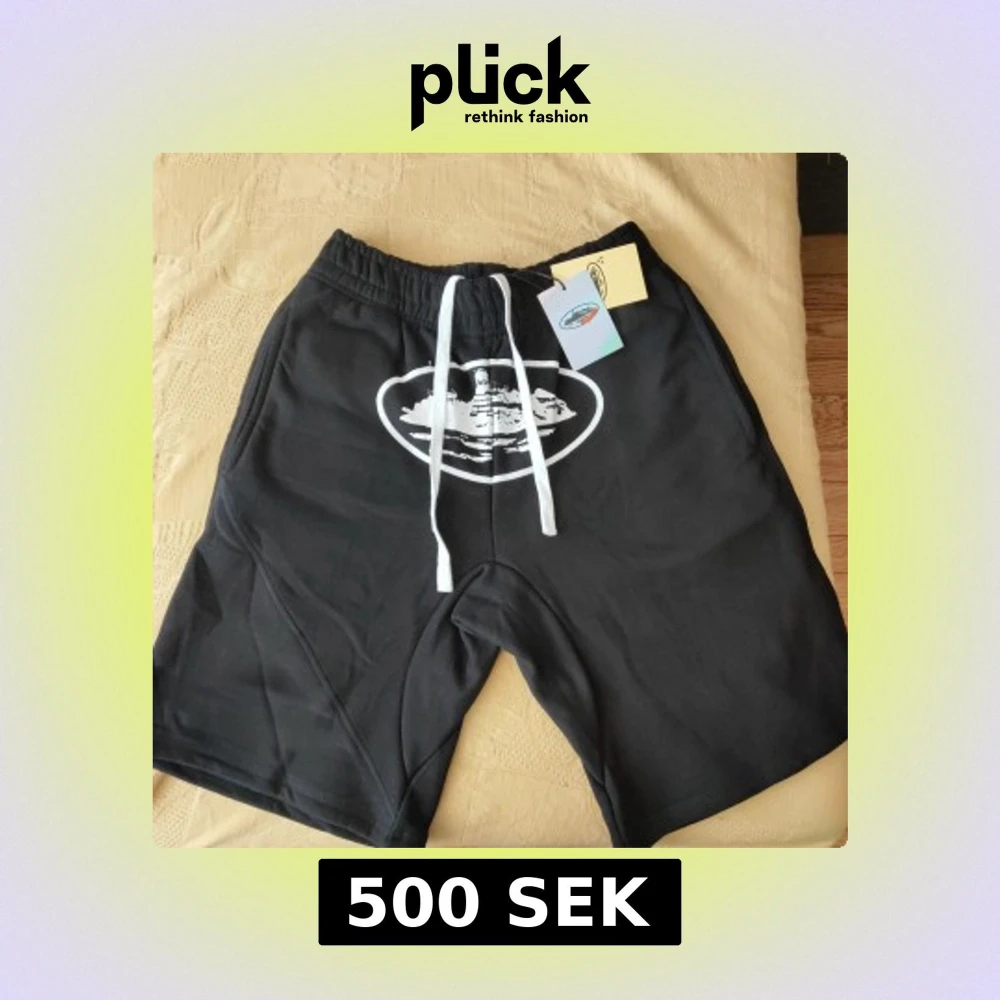 Svarta shorts från Cortiez med vitt grafiskt tryck framtill och breda vita snören i midjan. Modellen har elastisk midja och en bakficka med lock. Materialet är mjukt och skönt, perfekt för chill dagar. Snygg streetwear vibe och riktigt bekväma.