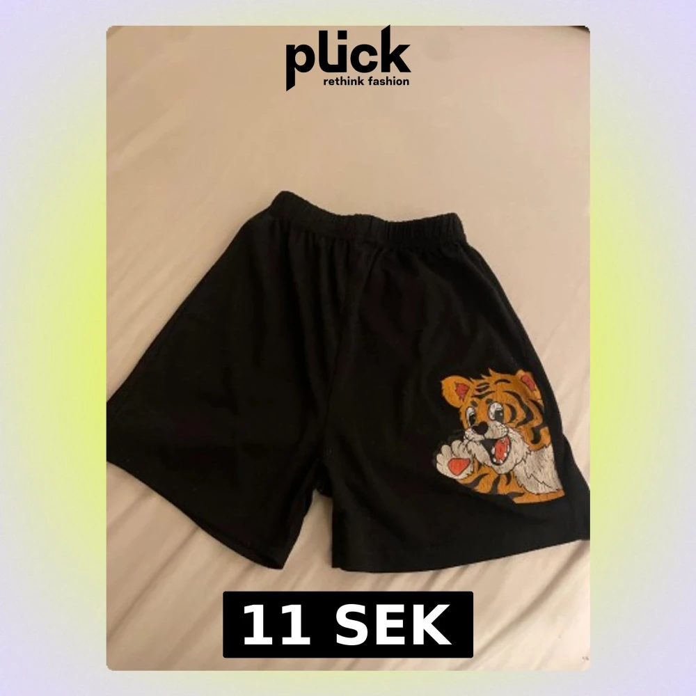 Svarta shorts från Shein med elastisk midja och ett coolt tryck av en tecknad tiger på ena benet. Mjukt material som känns skönt mot huden och loose passform. Perfekta för chill dagar eller när du vill ha något bekvämt och snyggt. Storlek 110/116. Barn till pojkar och flickor