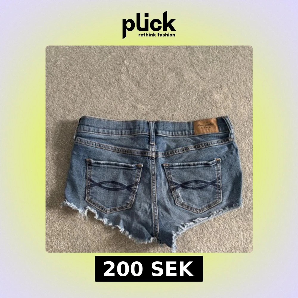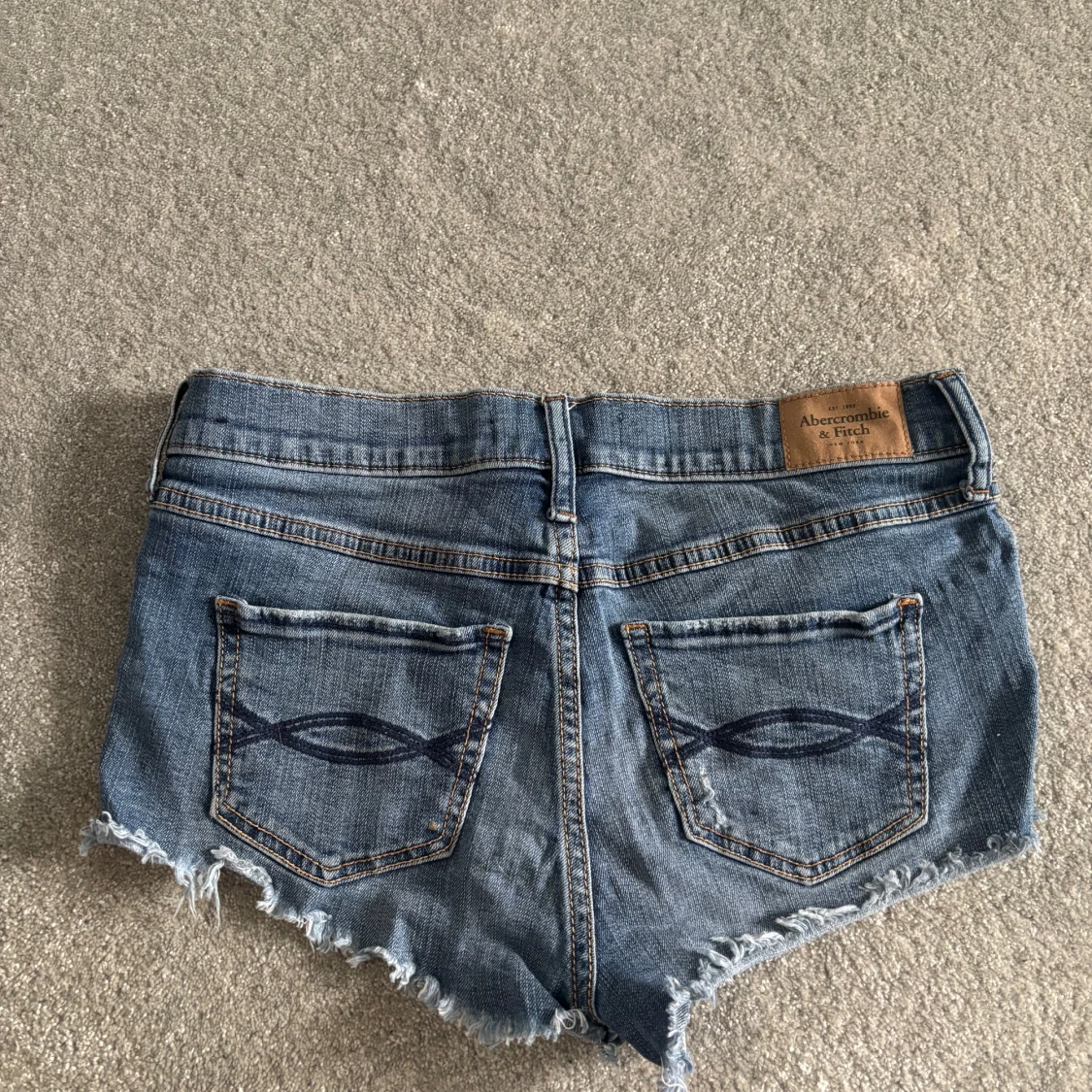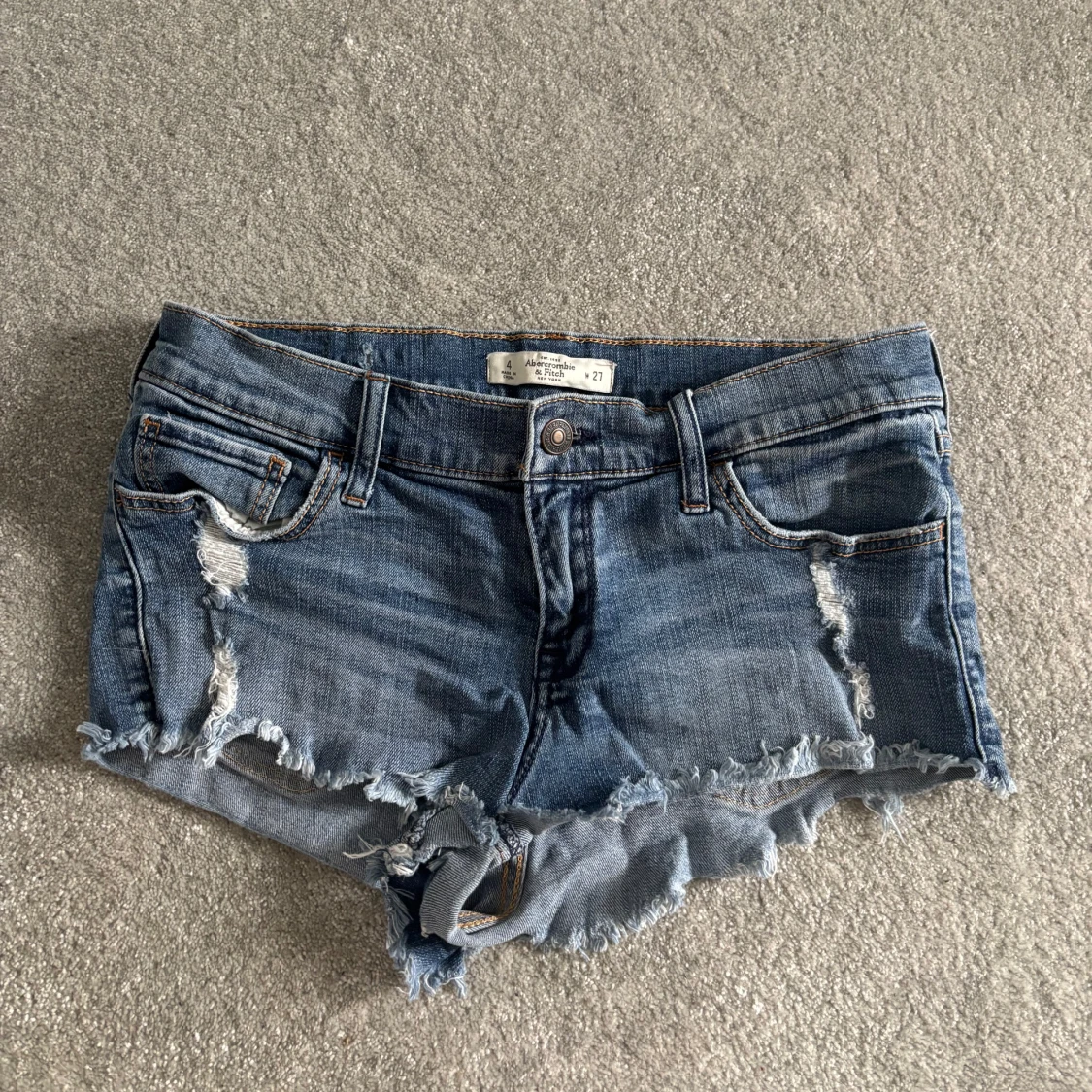 Snygga blå jeansshorts från Abercrombie & Fitch med fransig, rå kant och slitna detaljer framtill. Klassisk femficksmodell med broderade bakfickor och låg midja. Perfekta för varma dagar och en avslappnad look.