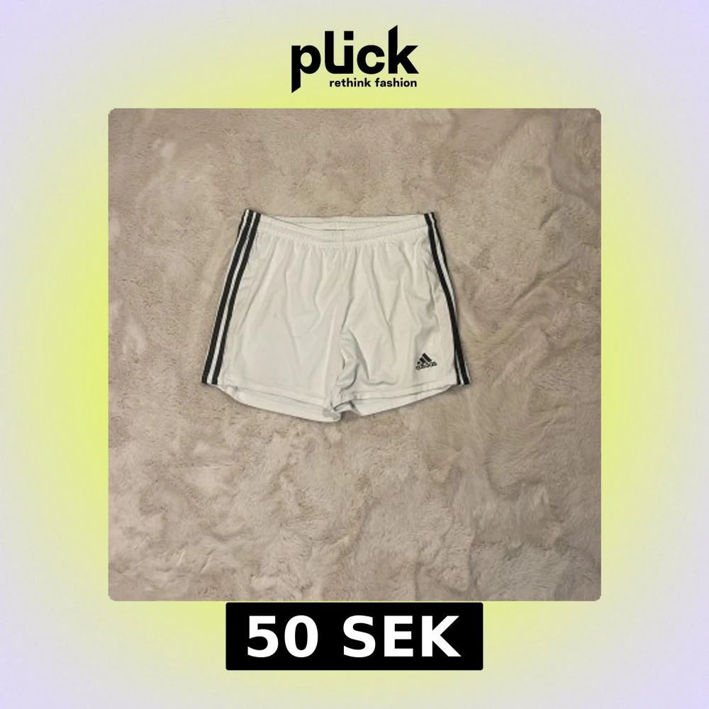 Snygga vita sportshorts från Adidas med klassiska svarta ränder längs sidorna och elastisk midja. Perfekta för träning eller fotboll, tillverkade i lätt och svalt syntetmaterial. Adidas-logga framtill ger en sportig vibe.