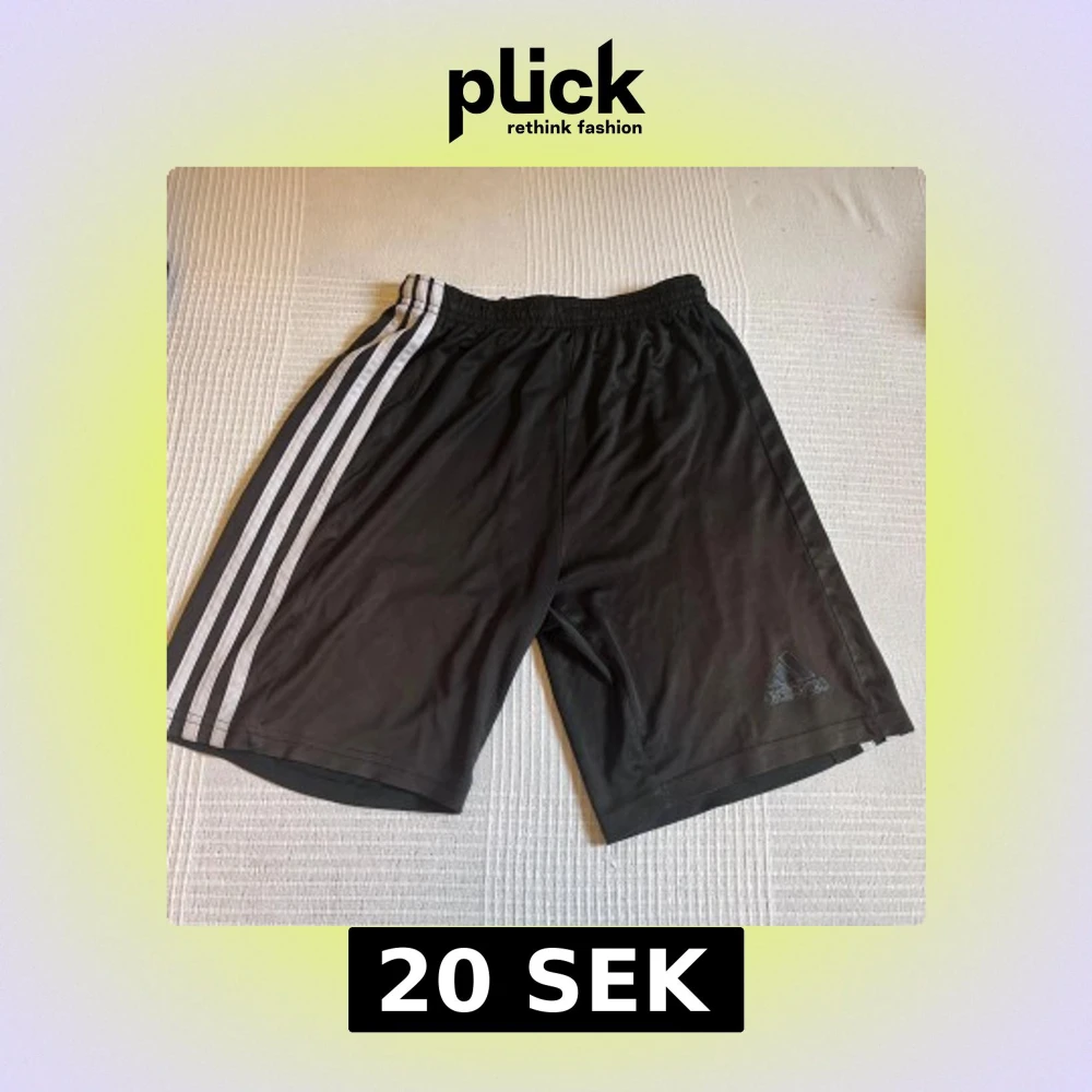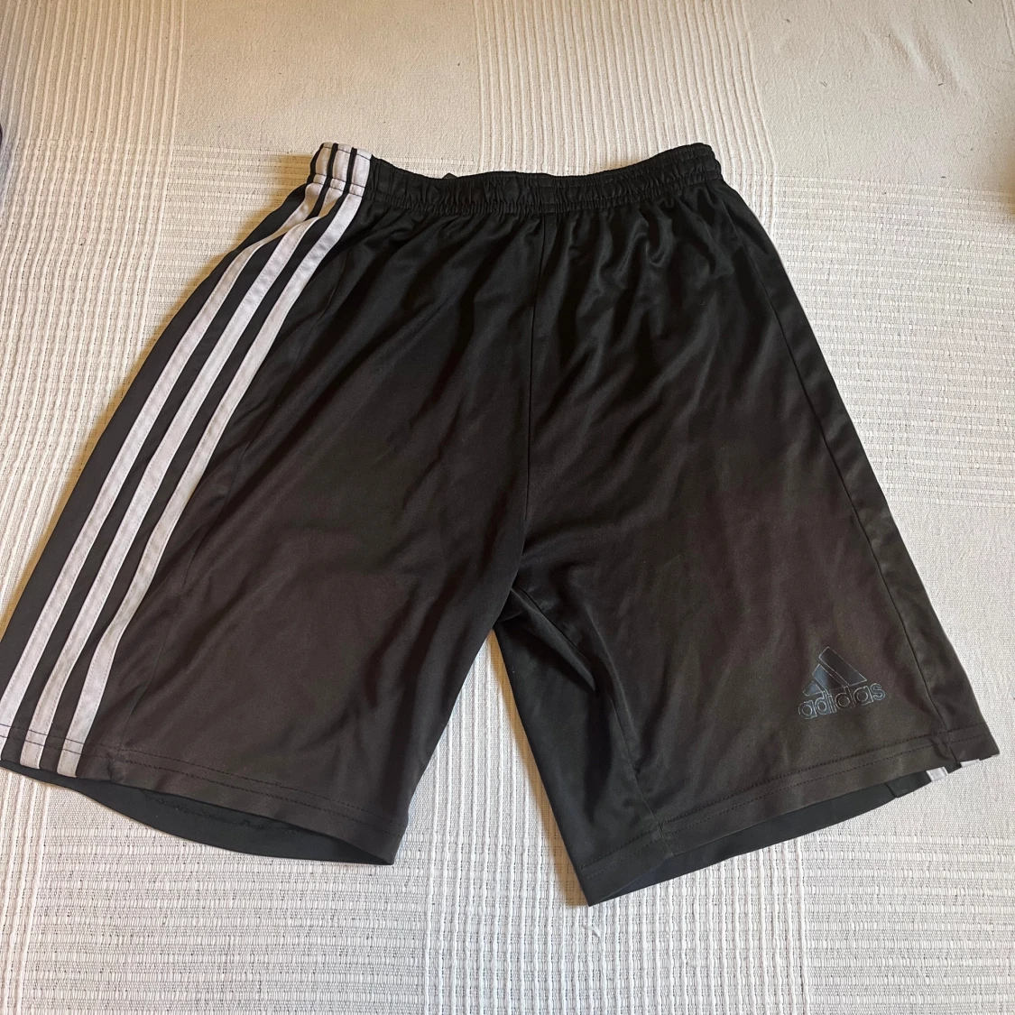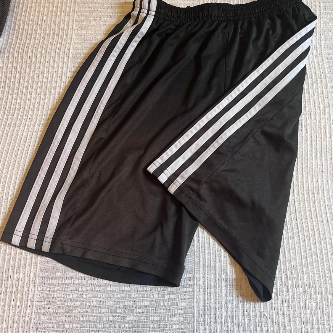 Svarta sportiga shorts från Adidas med klassiska vita ränder längs sidorna och Adidas-logga framtill i storlek M. De har elastisk midja och är gjorda i ett lätt och skönt syntetmaterial, perfekta för träning eller chill. Snygg loose passform och stilren design.
