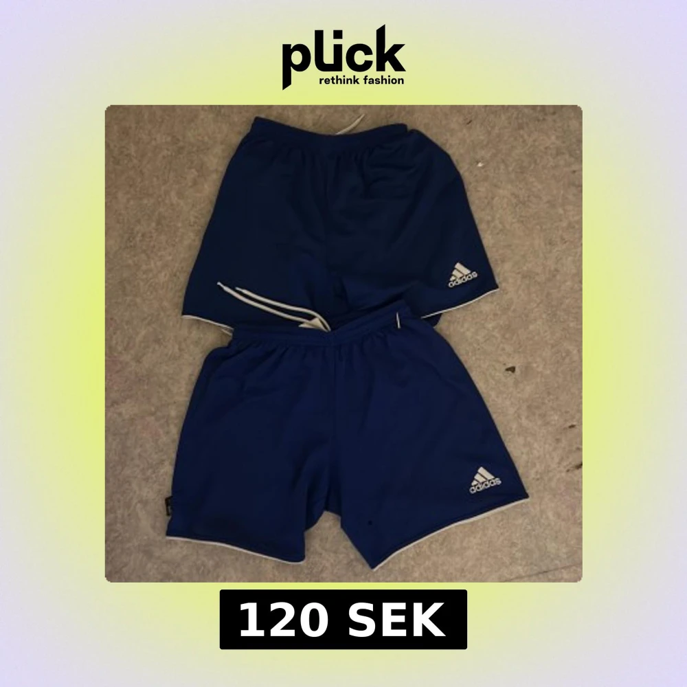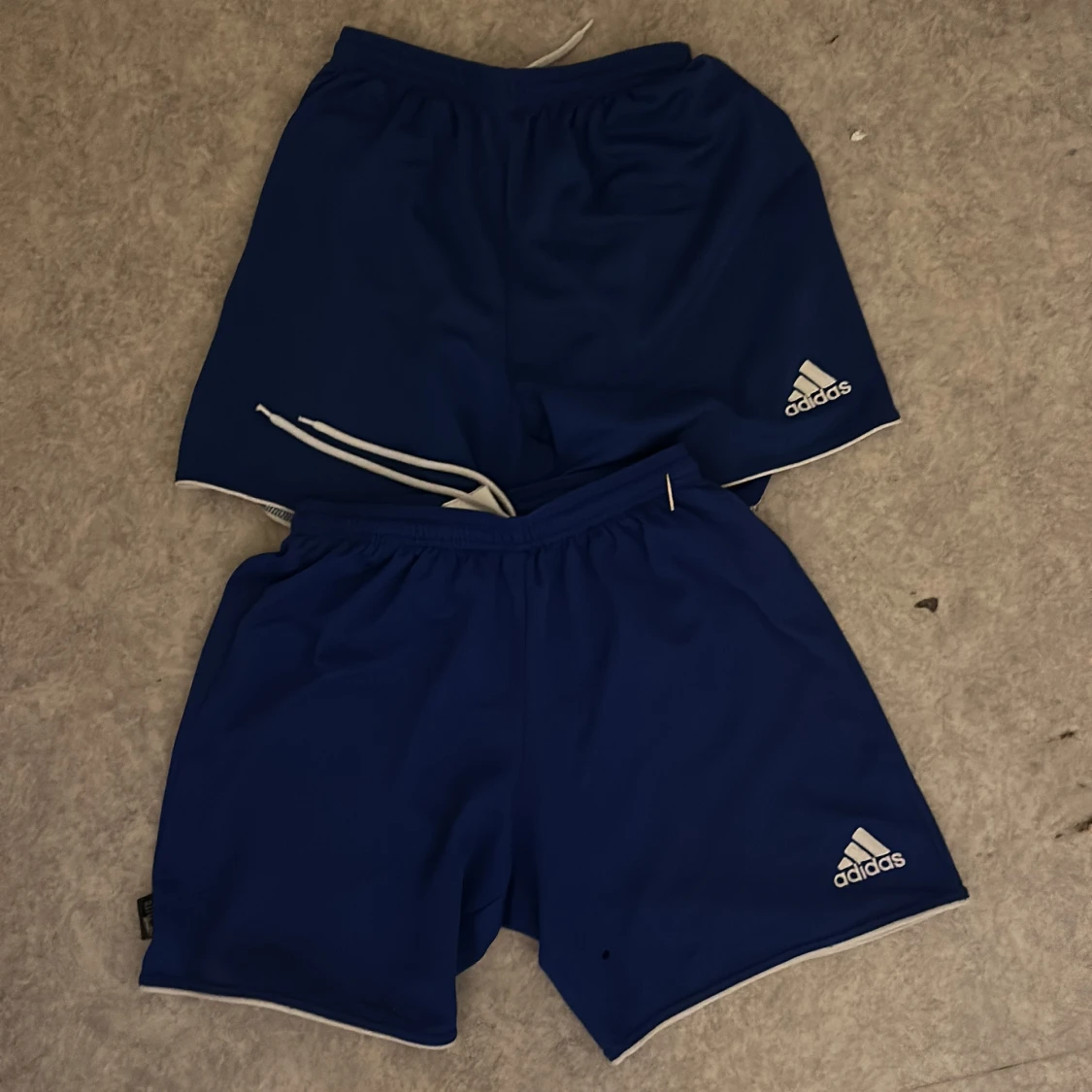 Två par blå träningsshorts från Adidas med vit logga på vänster ben och elastisk midja. Klassisk sportig look med enkel design, perfekta för fotbollen eller annan sport / för barn, 120 för båda