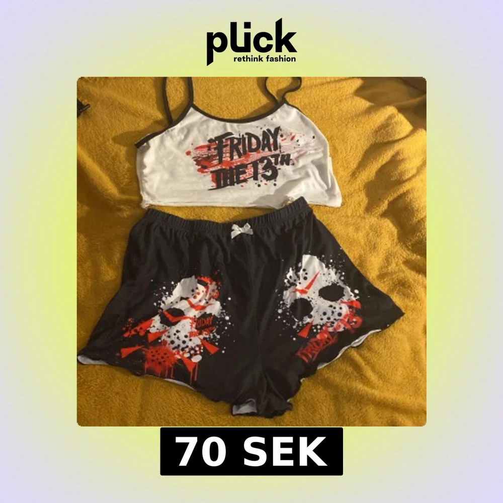 Svarta shorts med elastisk midja och vit rosett framtill. Tryck med Friday the 13th och Jason-mask i vitt, rött och svart, samt coola färgstänk. Perfekta för dig som älskar skräckfilmer och vill ha en chill och edgy stil.