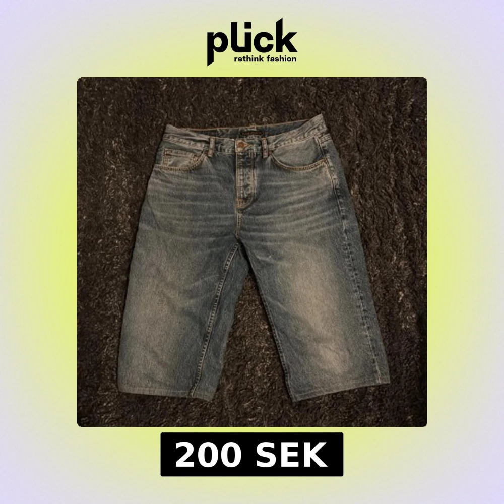 Säljer ett par coola jeansshorts från Nudie Jeans. De är i en klassisk blå denimfärg med femficksdesign och knappgylf. Perfekta för en avslappnad stil. Waist är 32 men längden passar nog någon som är 190-200.