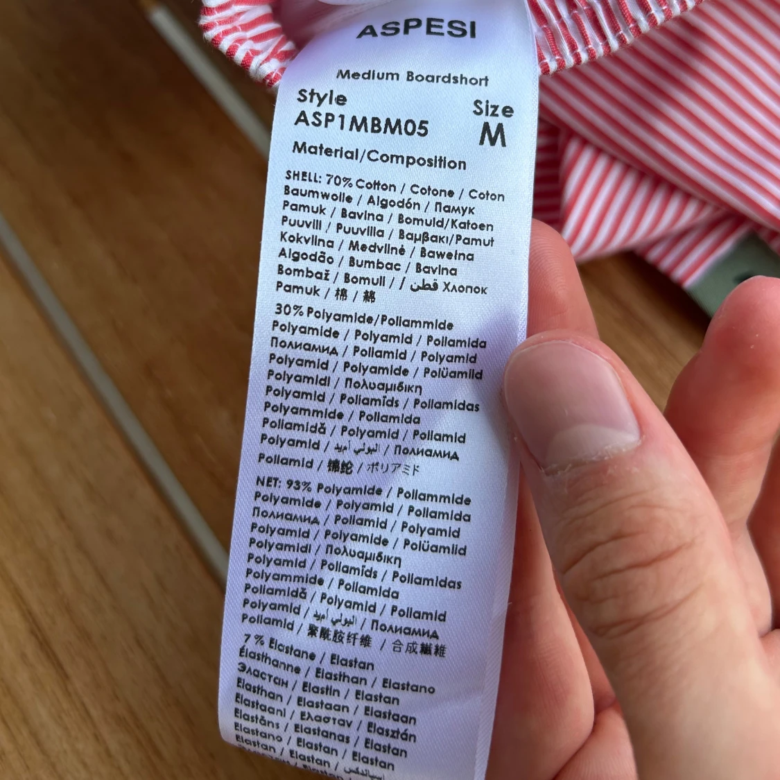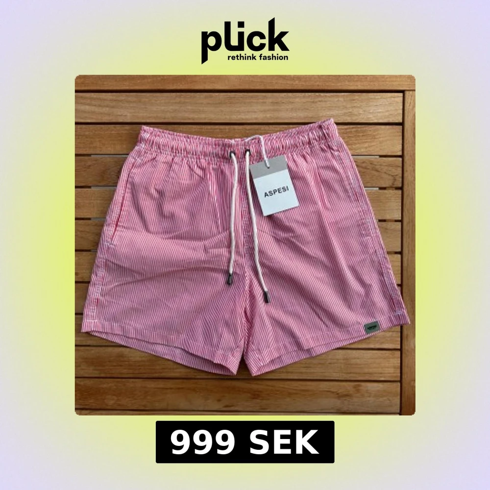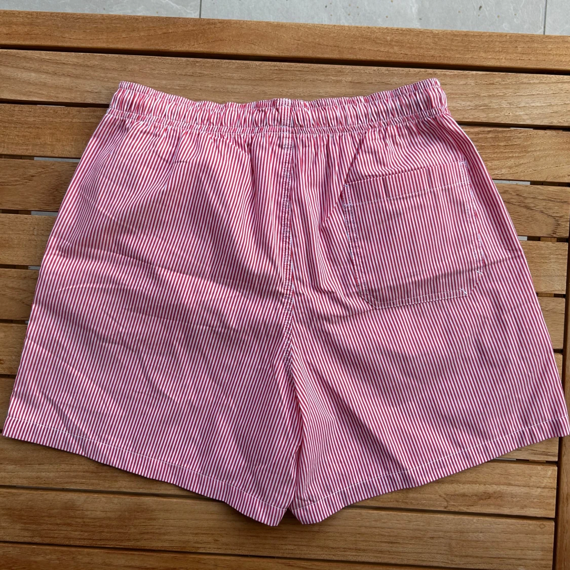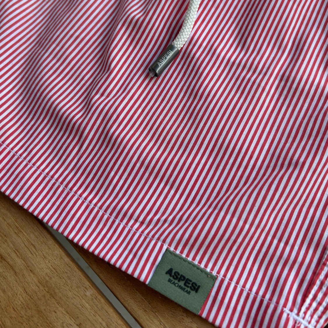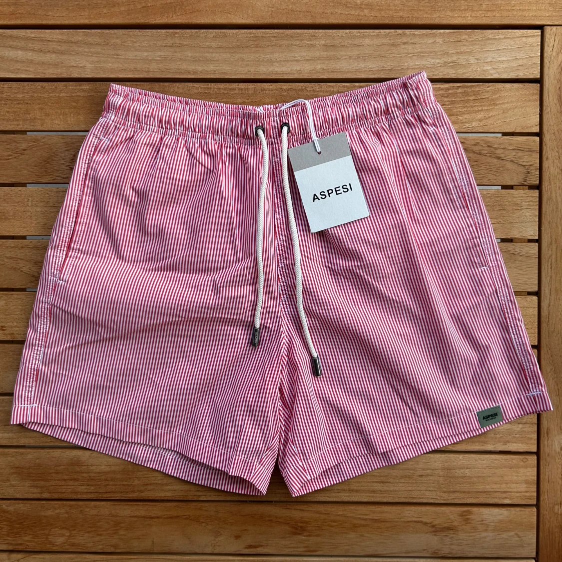 Snygga röda och vita badshorts från Aspesi med smala ränder och elastisk midja. Helt nya med tags, inga defekter förekommer. Perfekta för stranden eller poolen. Ordinarie nypris ca 2000:-