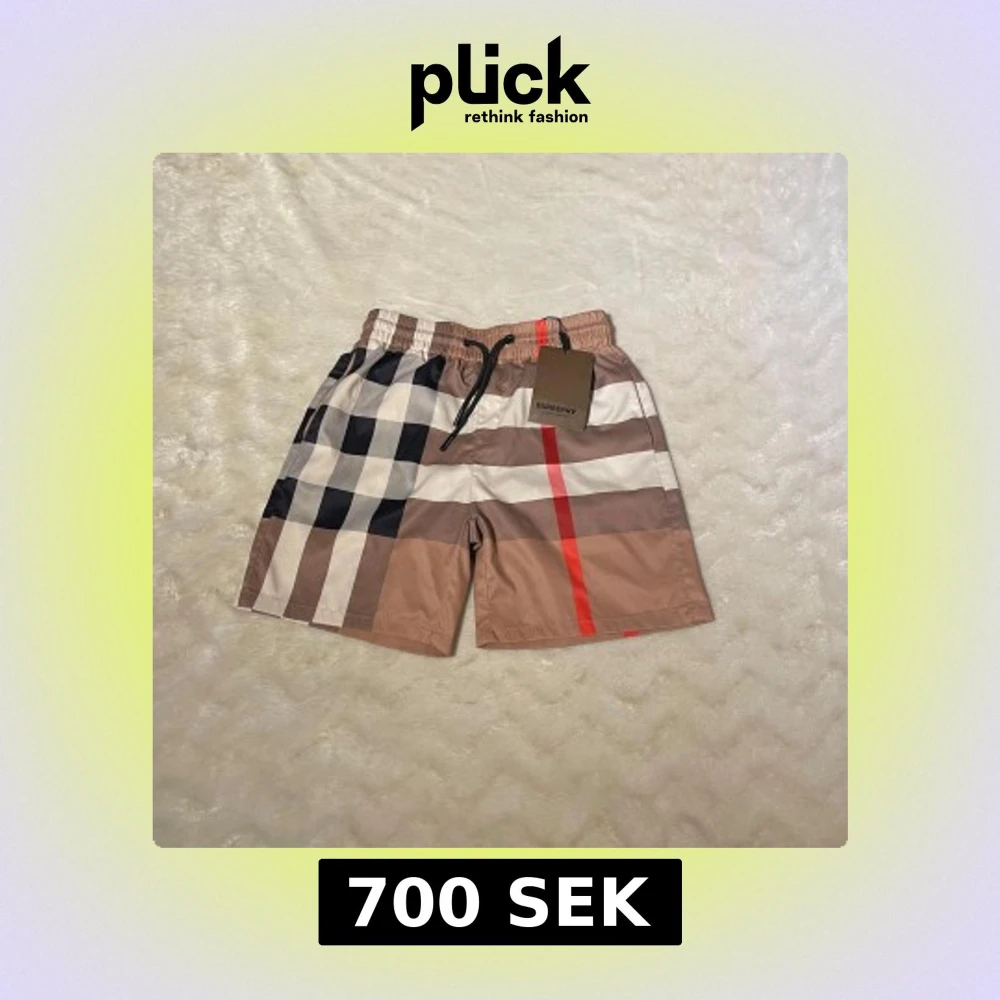 Snygga shorts från Burberry med klassiskt rutigt mönster i beige, svart, vitt och rött. De har elastisk midja med svart snörning och är tillverkade i ett lätt syntetmaterial. Perfekta för sommaren och ger en lyxig vibe till din outfit. Pris kan diskuteras