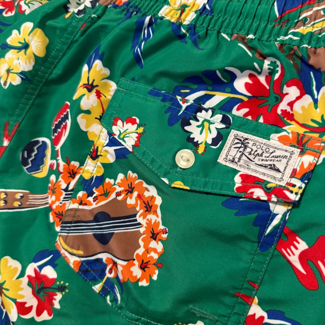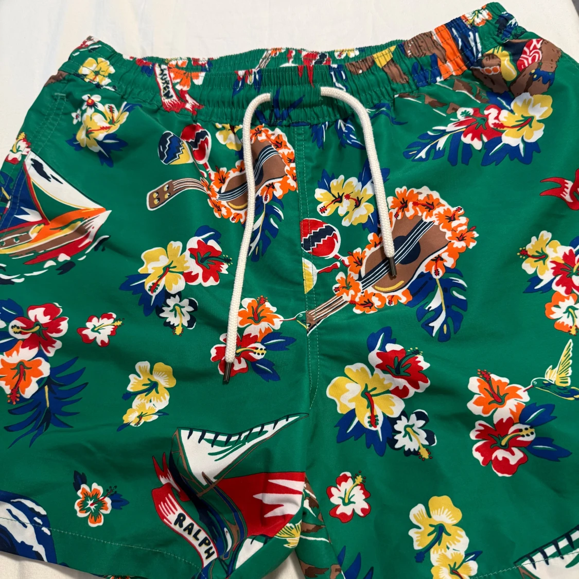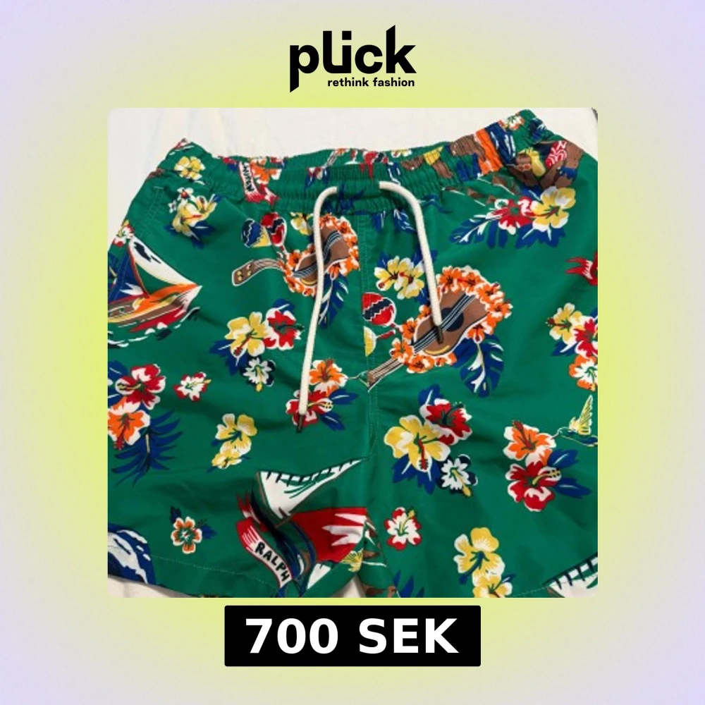 Snygga gröna badshorts med färgglatt blommönster och gitarrer från Polo Ralph Lauren. Nypris 1395kr. De har en elastisk midja med vit snörning och en praktisk bakficka med knapp. Perfekta för sommarens stranddagar!