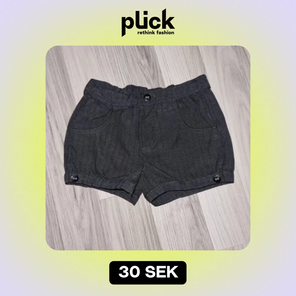 Ett par mörkgrå shorts med knappar framtill och vid bensluten. Shortsen har två framfickor och en elastisk midja. Från Lindex i storlek 110/116