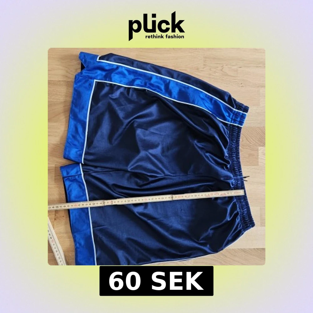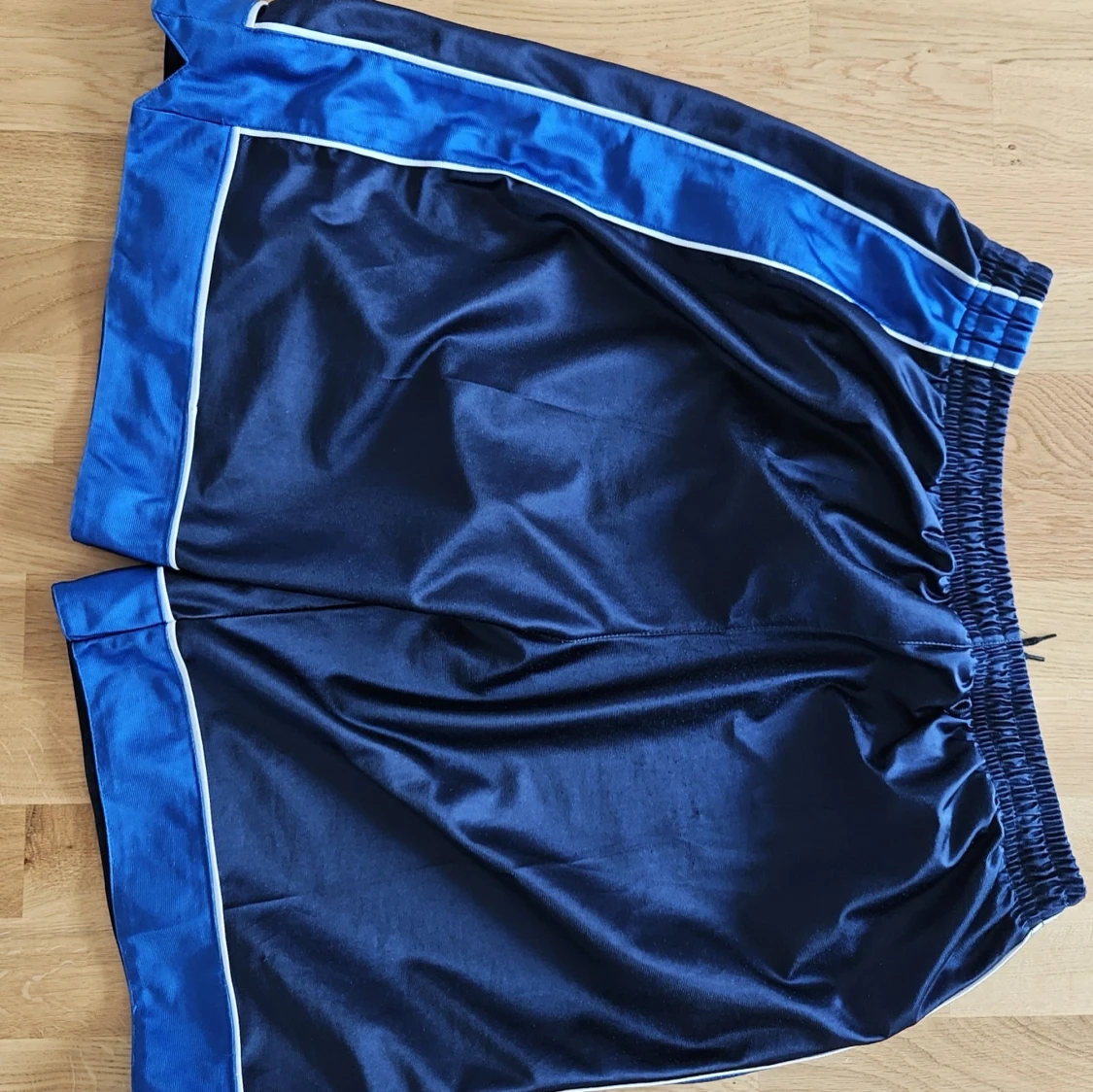 Snygga marinblå sportshorts med breda blå paneler och vita kantlinjer längs sidorna. Shortsen har elastisk midja med snörning för skön passform och är gjorda i glansigt syntetmaterial som känns lätt och luftigt. Perfekta för träning eller chill.