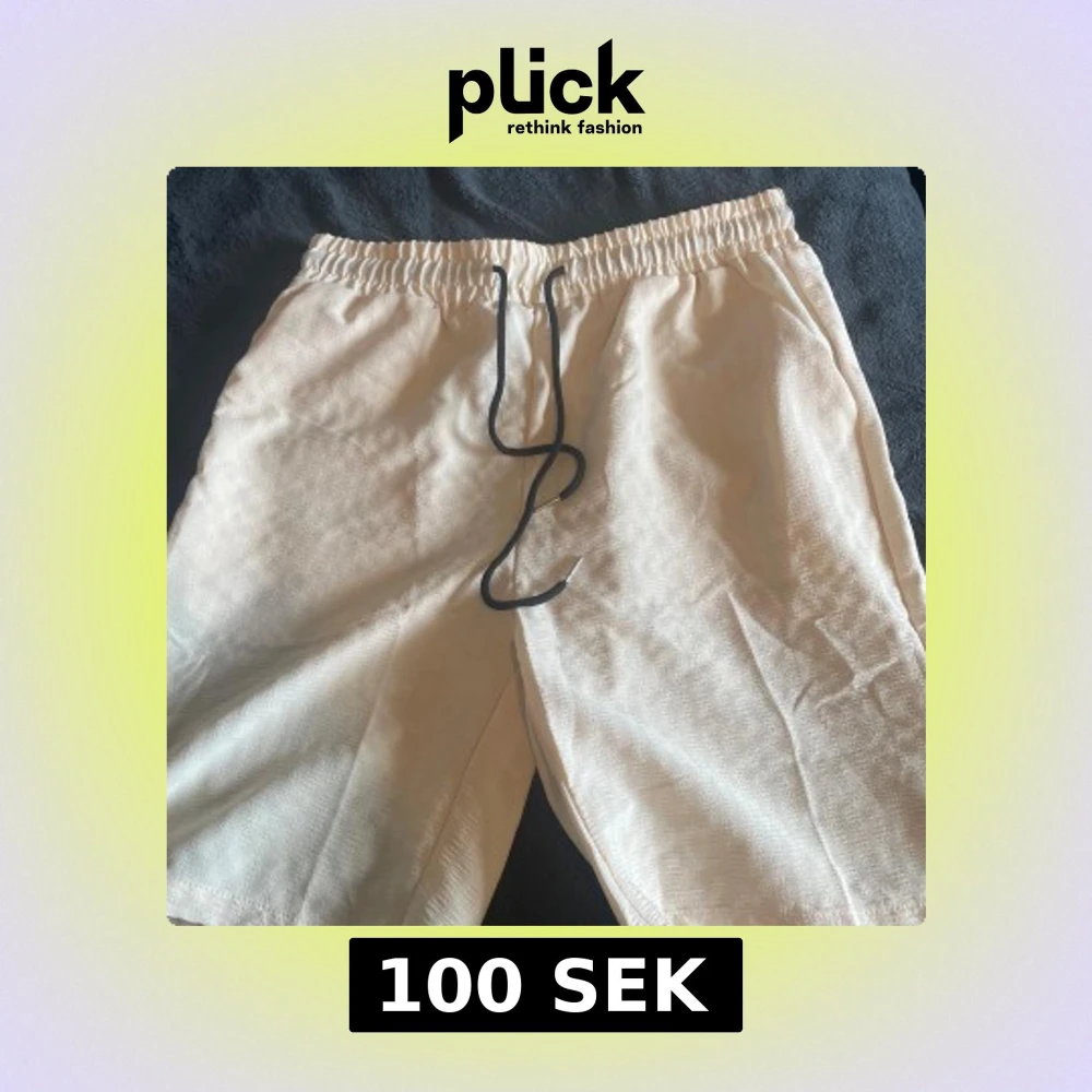 Snygga beiga shorts med elastisk midja och svart snörning framtill. De har en rak passform och är tillverkade i ett lätt tyg som passar perfekt för varma dagar. Shortsen har fickor på sidorna och en stilren, enkel look.