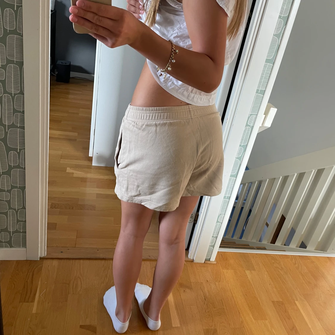 Ett par sköna beigea mjukis shorts med fickor från gina tricot. De har en elastisk midja så de är töj bara och tillverkade i mjukt bomullsmaterial. De är i storlek xs