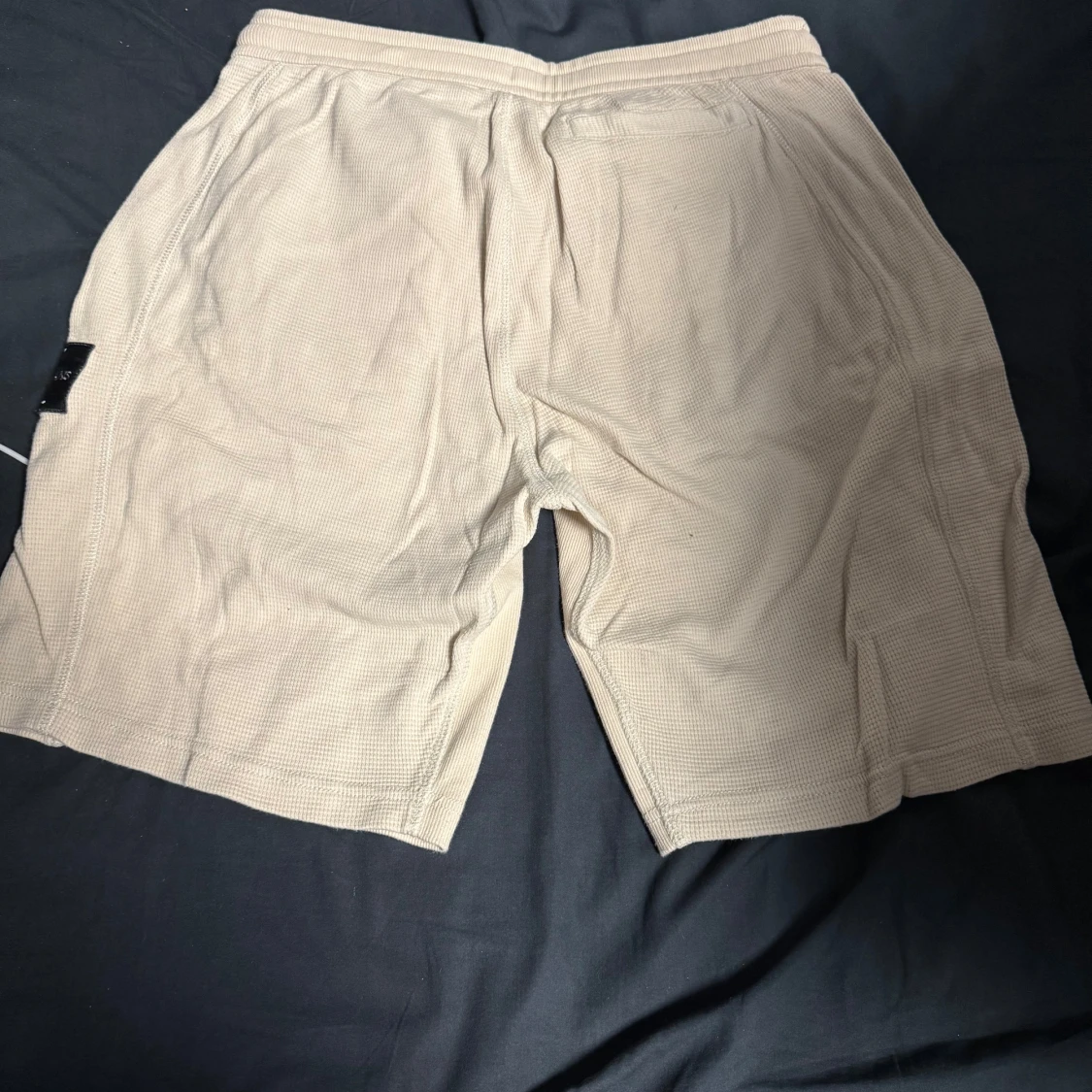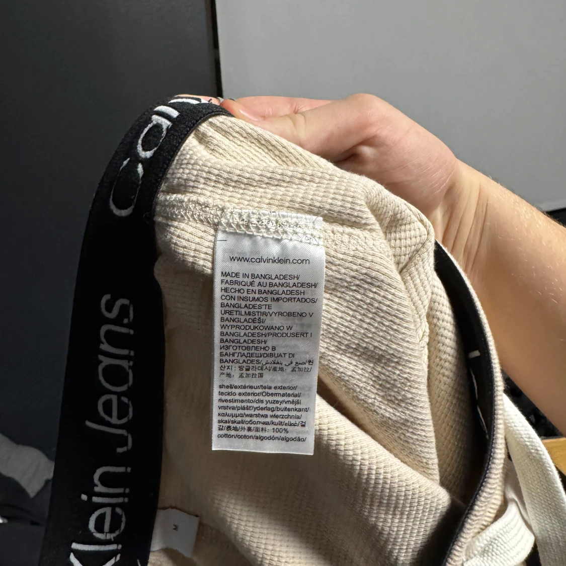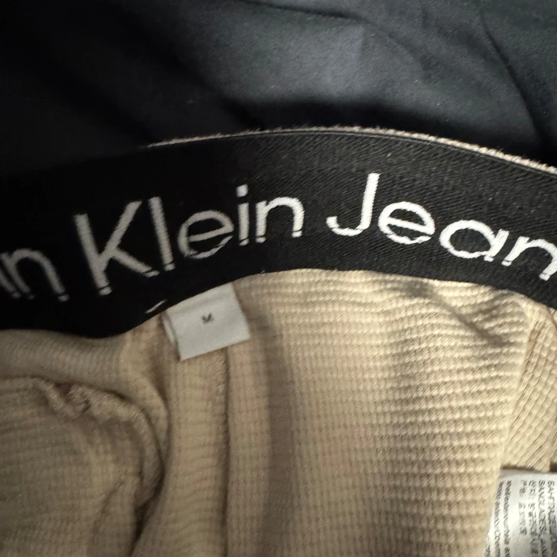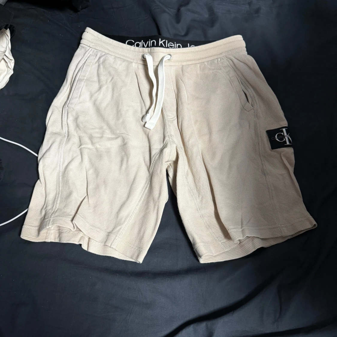 Snygga beige shorts från Calvin Klein med snörning i midjan och ett diskret märke på sidan. Perfekta för en avslappnad stil.
