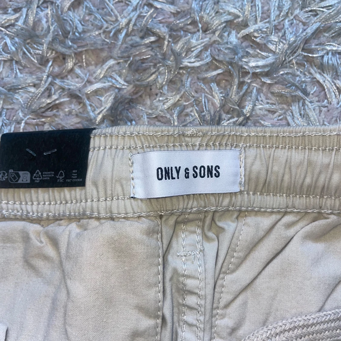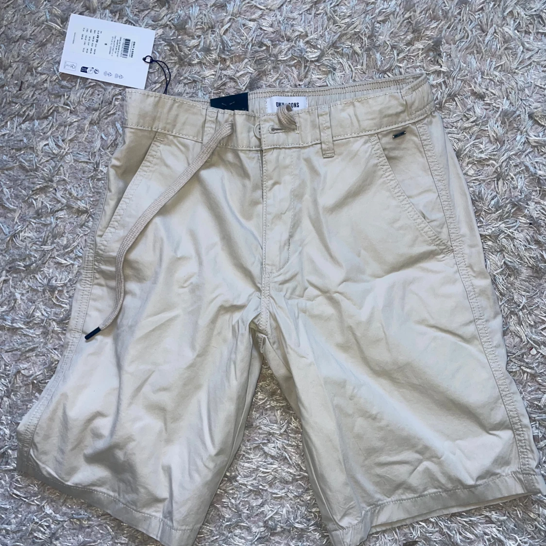 Snygga beige shorts från Only & Sons med rak passform och midwaist i storlek S! Helt oanvända med prislappen kvar, nypris 700kr. Säljer även ett par exakt likadana i svart 🌸