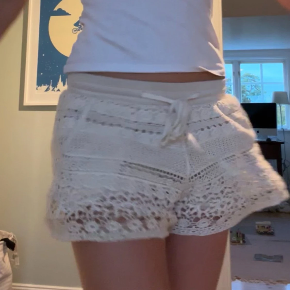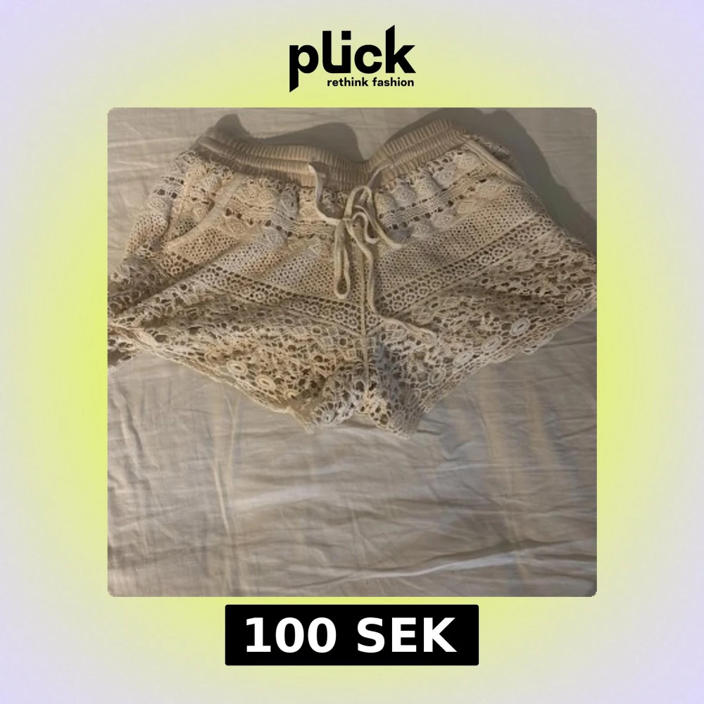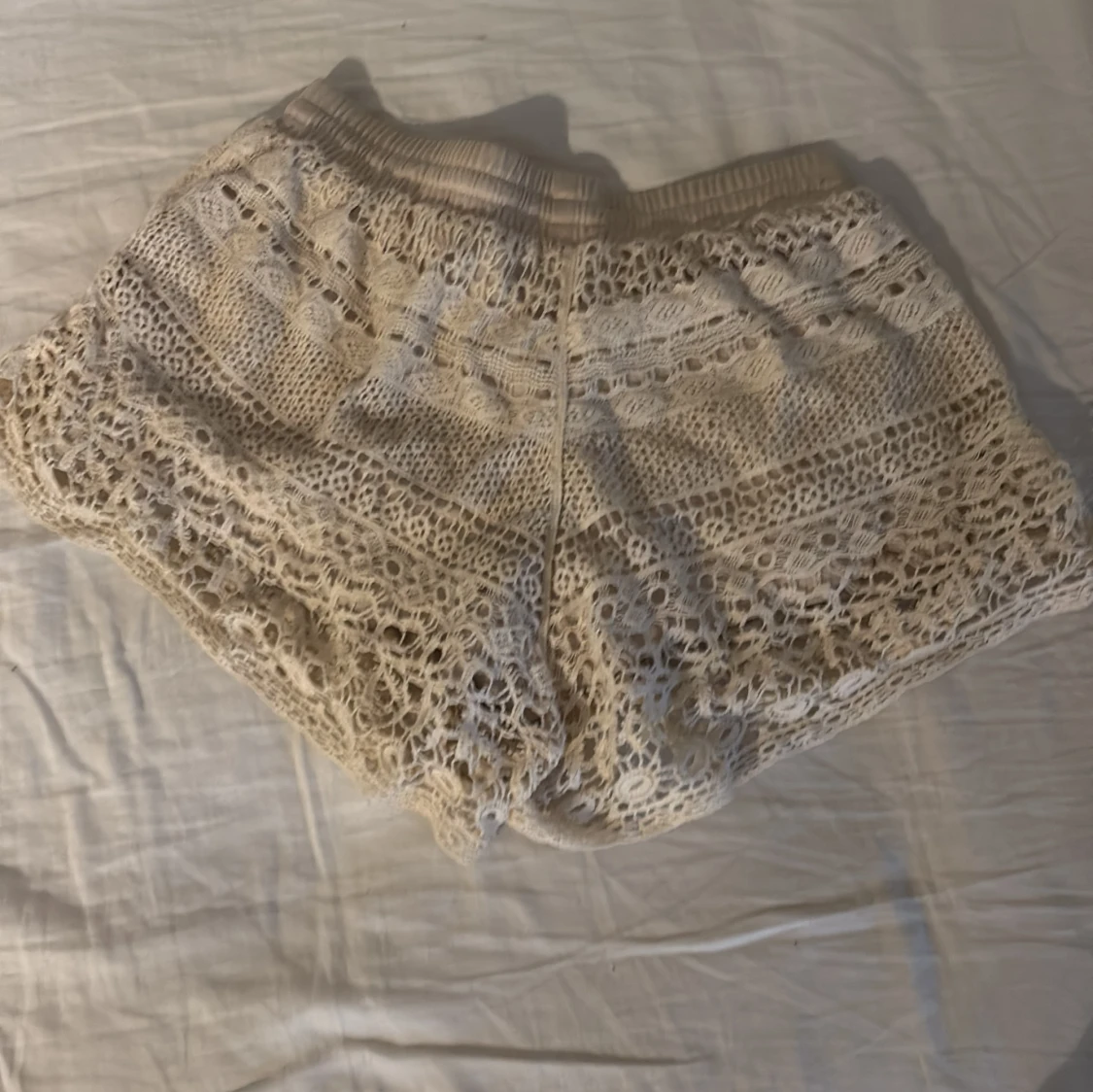 Säljer ett par beige virkade shorts med snygg snörning i midjan. De har ett detaljerat spetsmönster och elastisk midja för skön passform. Perfekta för varma dagar och ger en chill vibe till din outfit. Dem är svin sköna så ja brukade även ha dem till myskvällar❤️ Säljer då jag inte har användning för dem längre❤️ Säljer för 100 pris kan diskuteras