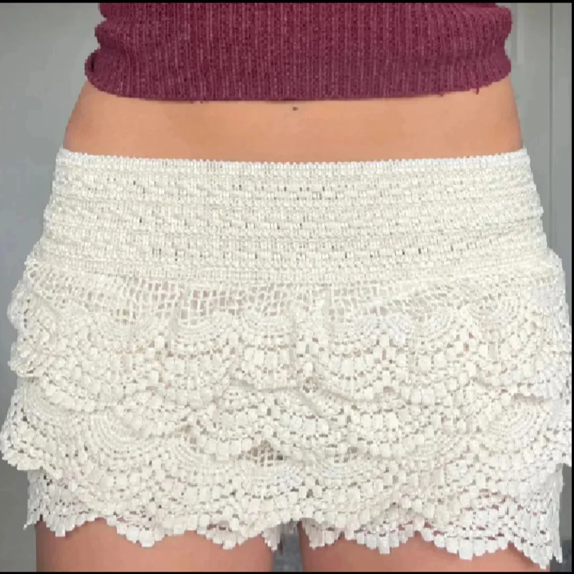 Superfina beige virkade shorts med flera lager volanger. De har en elastisk midja och är perfekta för varma dagar. Postar inom 24 timmar!