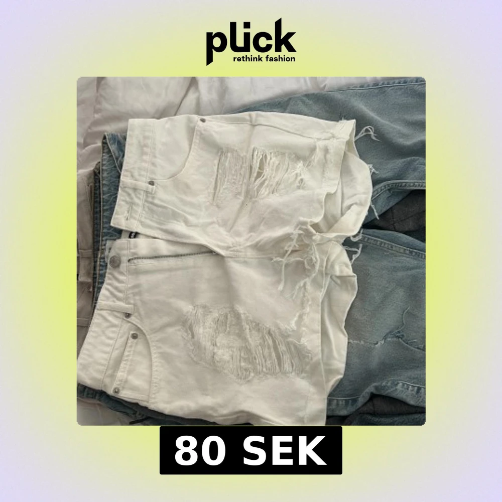 Snygga vita jeansshorts med rejält slitna detaljer framtill och råa kanter. Klassisk femficksmodell med dragkedja och knapp. Oanvända
