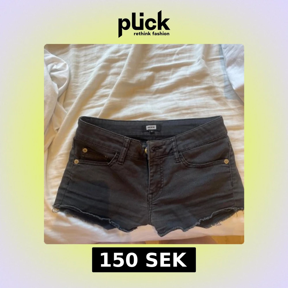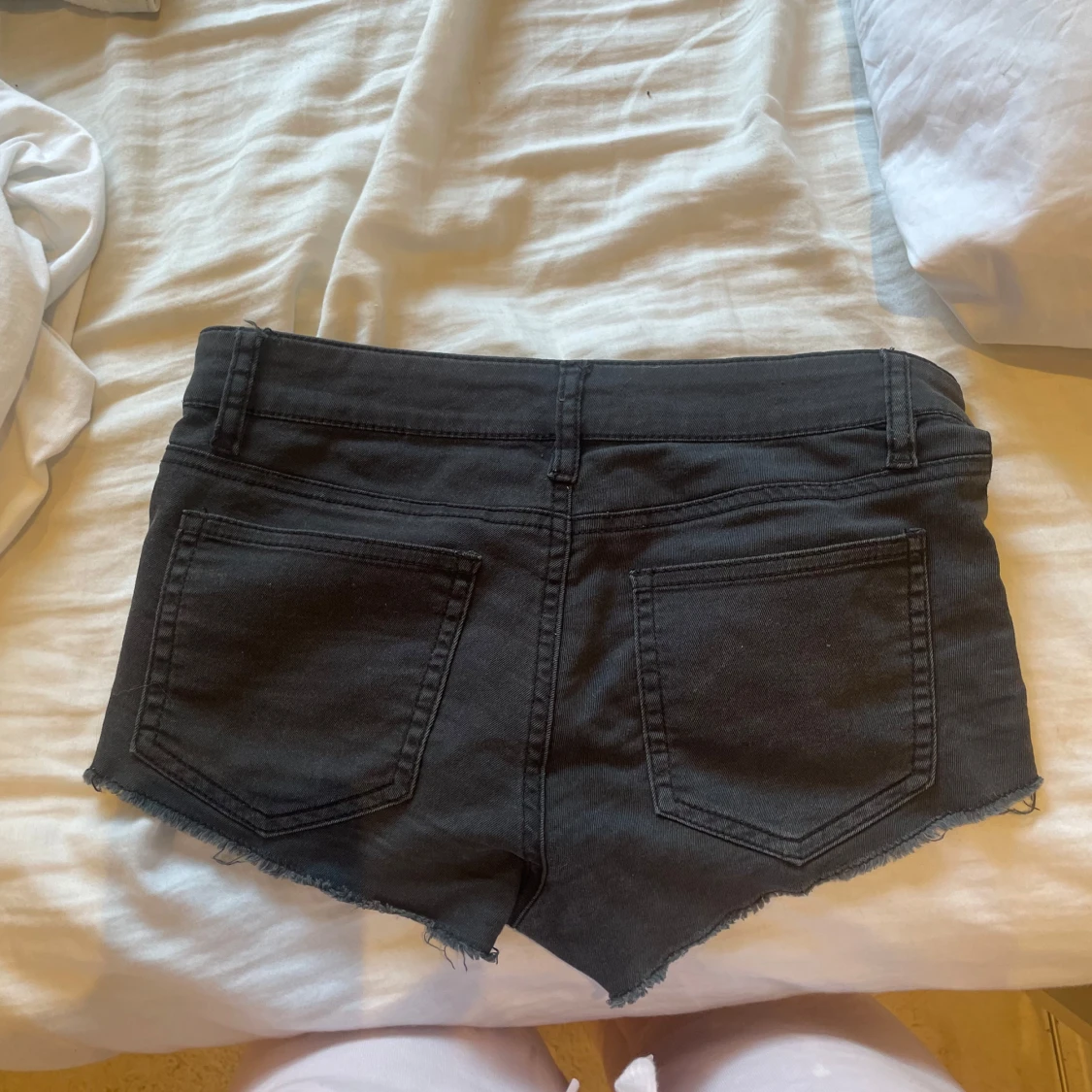 ett par svarta lågmidjade jeansshorts som tyvärr är för små för mig.