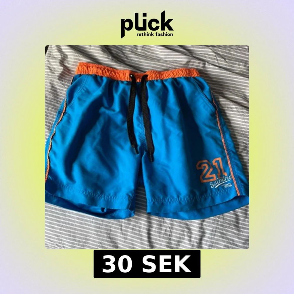 Snygga blå badshorts från Salming med orange midjeresår och detaljer. Svart snörning i midjan och tryckt nummer 21 framtill. Perfekta för stranden eller poolen, med sportig vibe och bekväm passform.