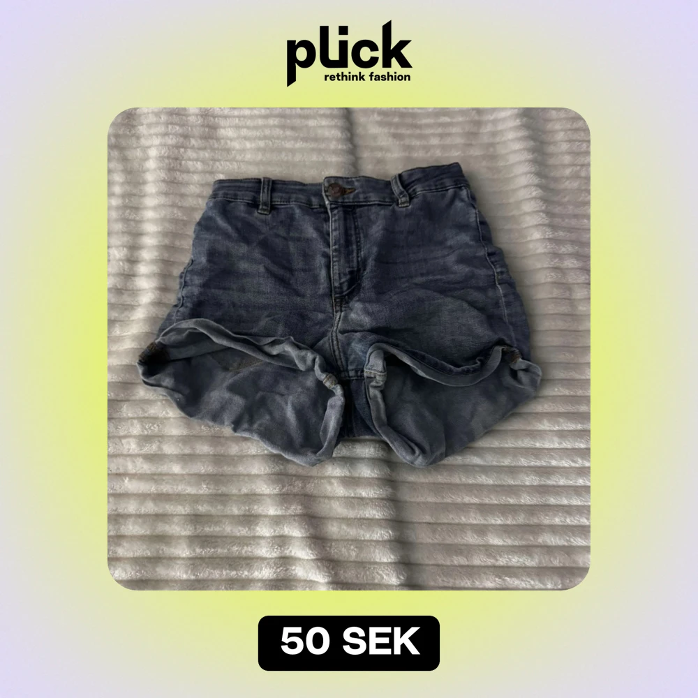 Säljer ett par klassiska blå jeansshorts med hög midja. De har en avslappnad passform och uppvikta kanter. Perfekta för sommardagar!⚠️ Ni betalar för frakt⚠️