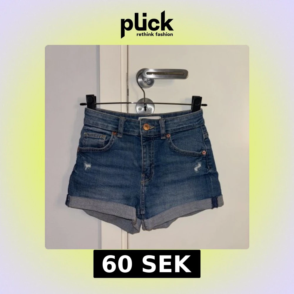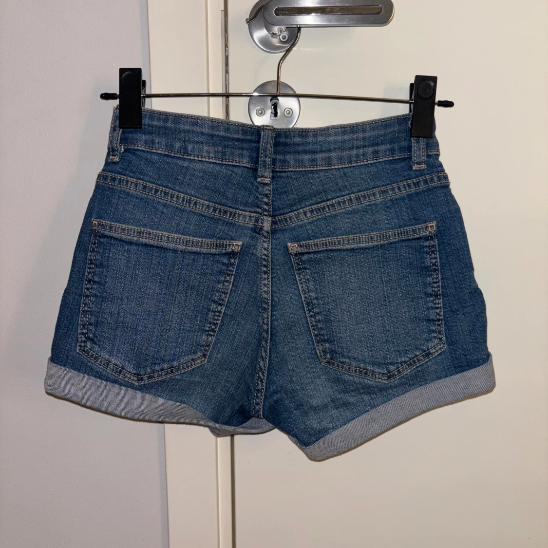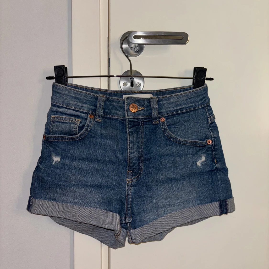 Snygga blå jeansshorts från Bershka med upprullade benslut och klassisk femficksdesign. Storlek 32