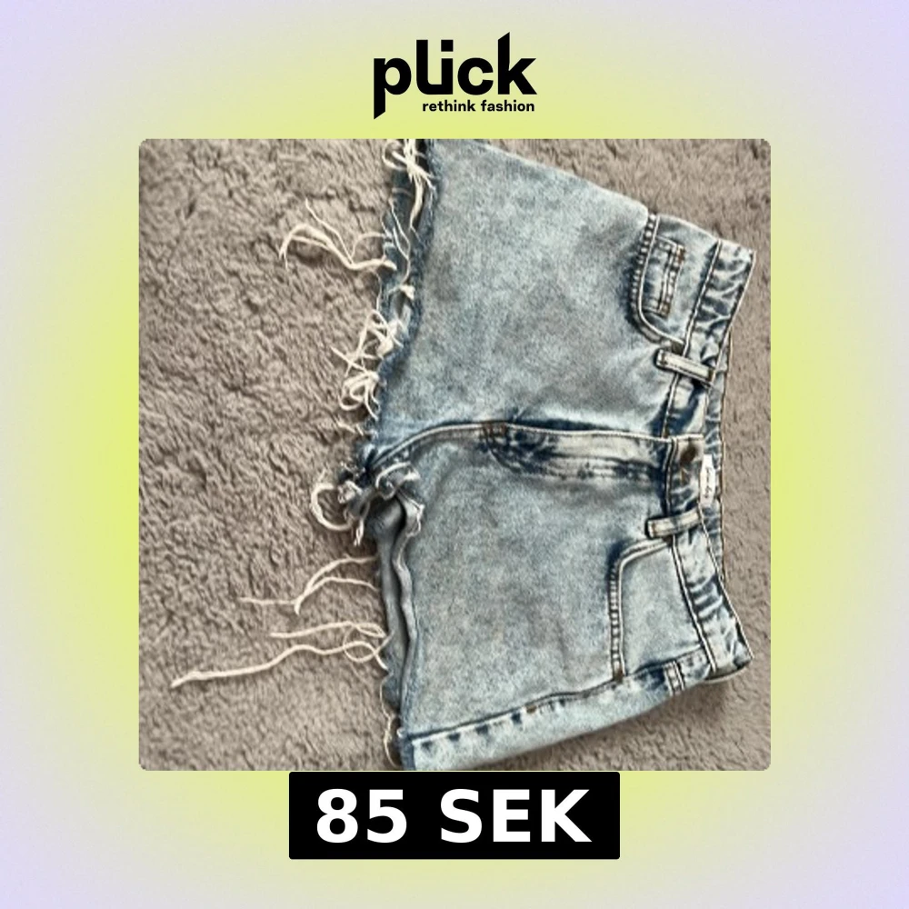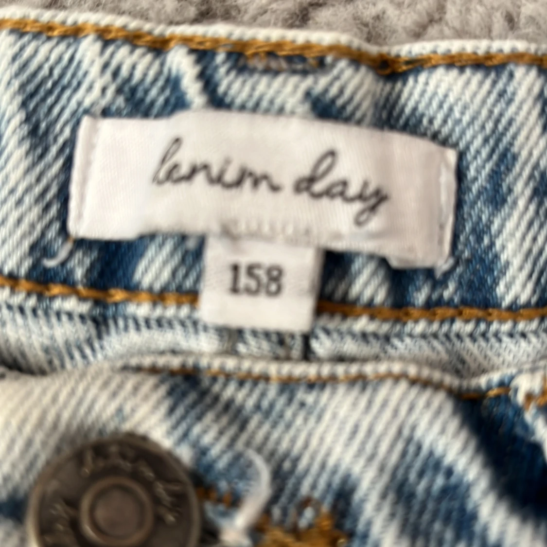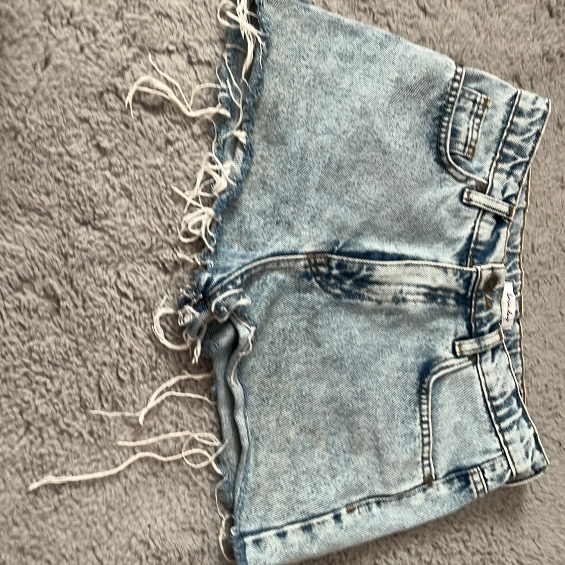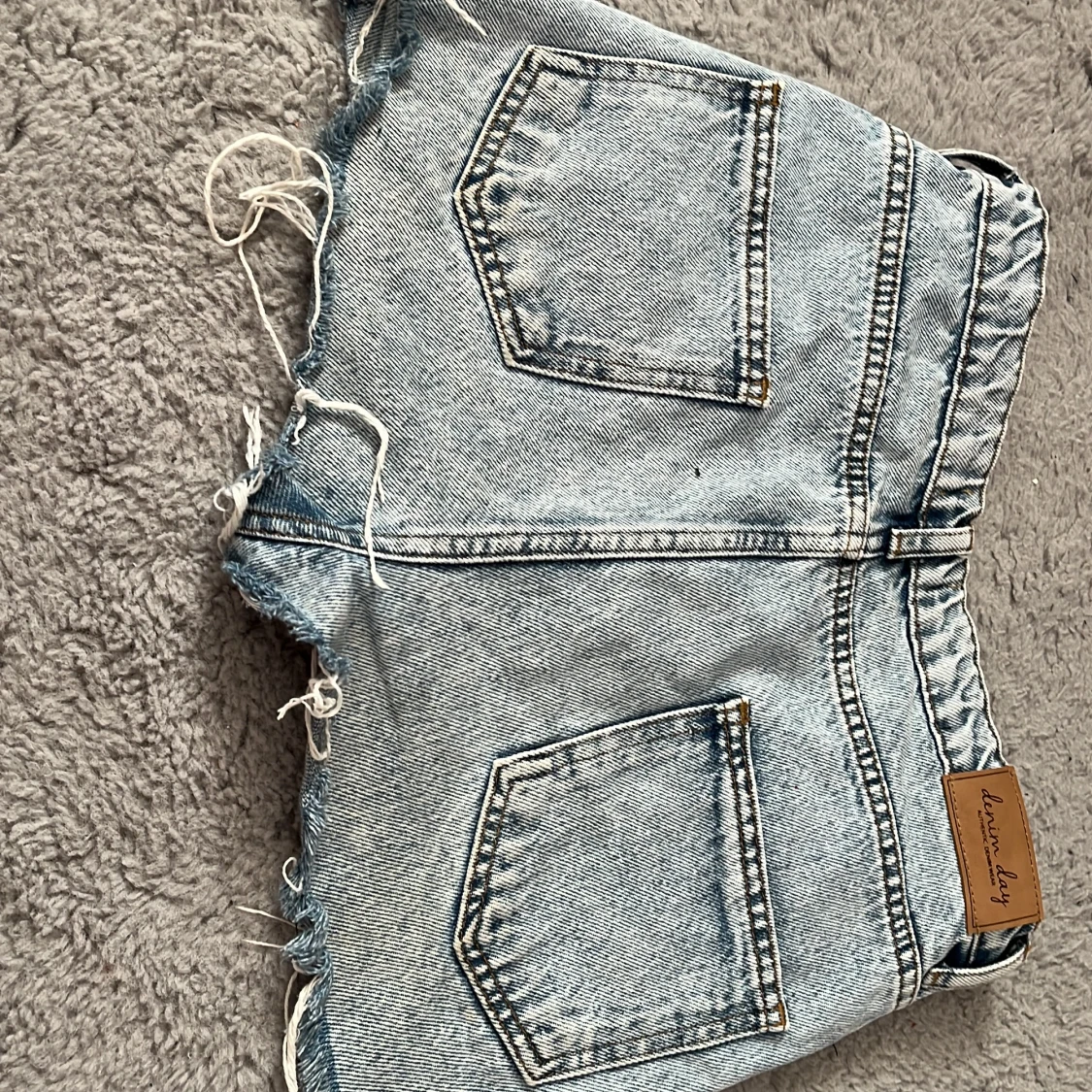 Säljer ett par snygga blå jeansshorts från Denim Day. De har en fransig kant och klassisk femficksdesign. Perfekta för en avslappnad stil.