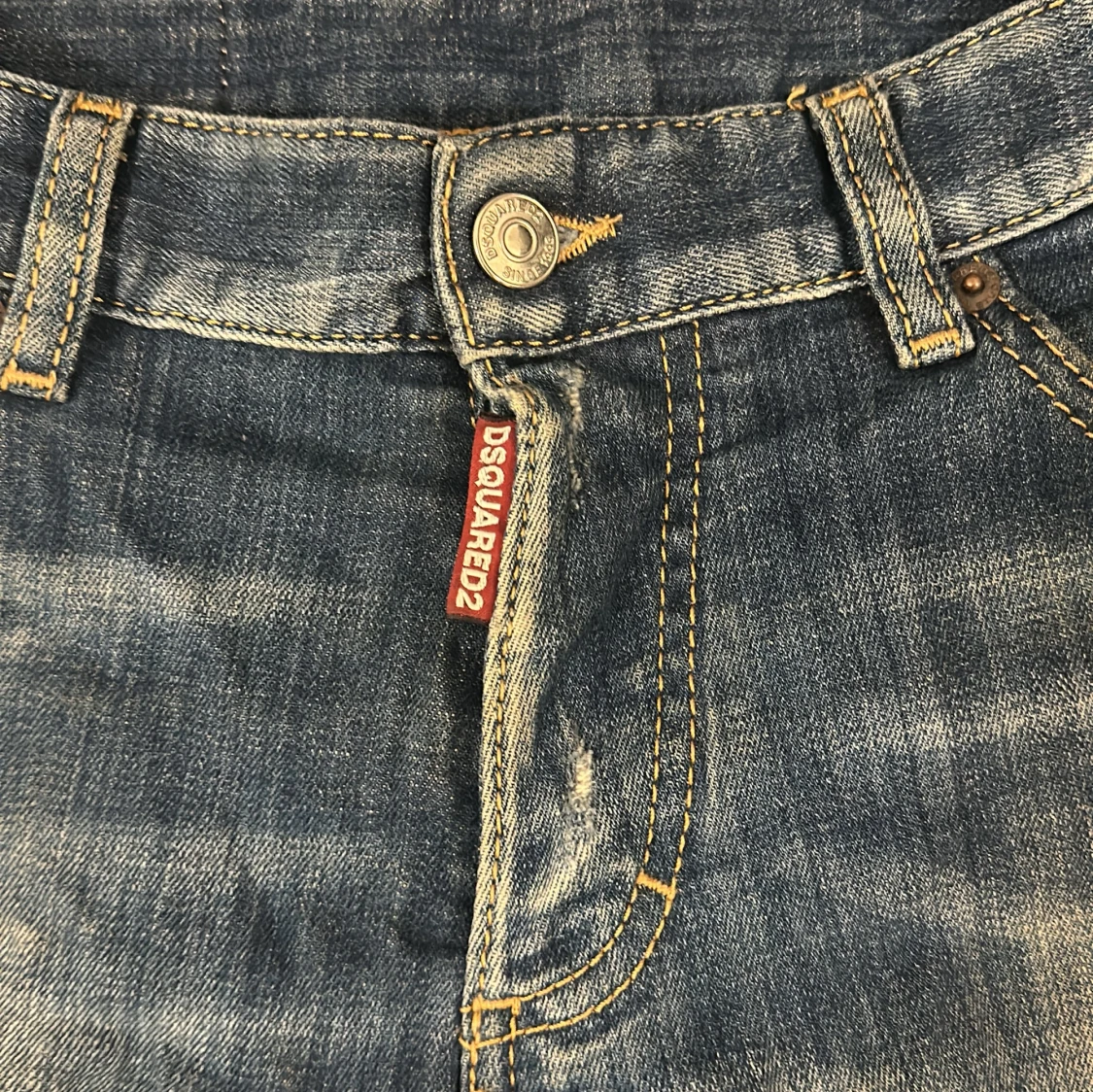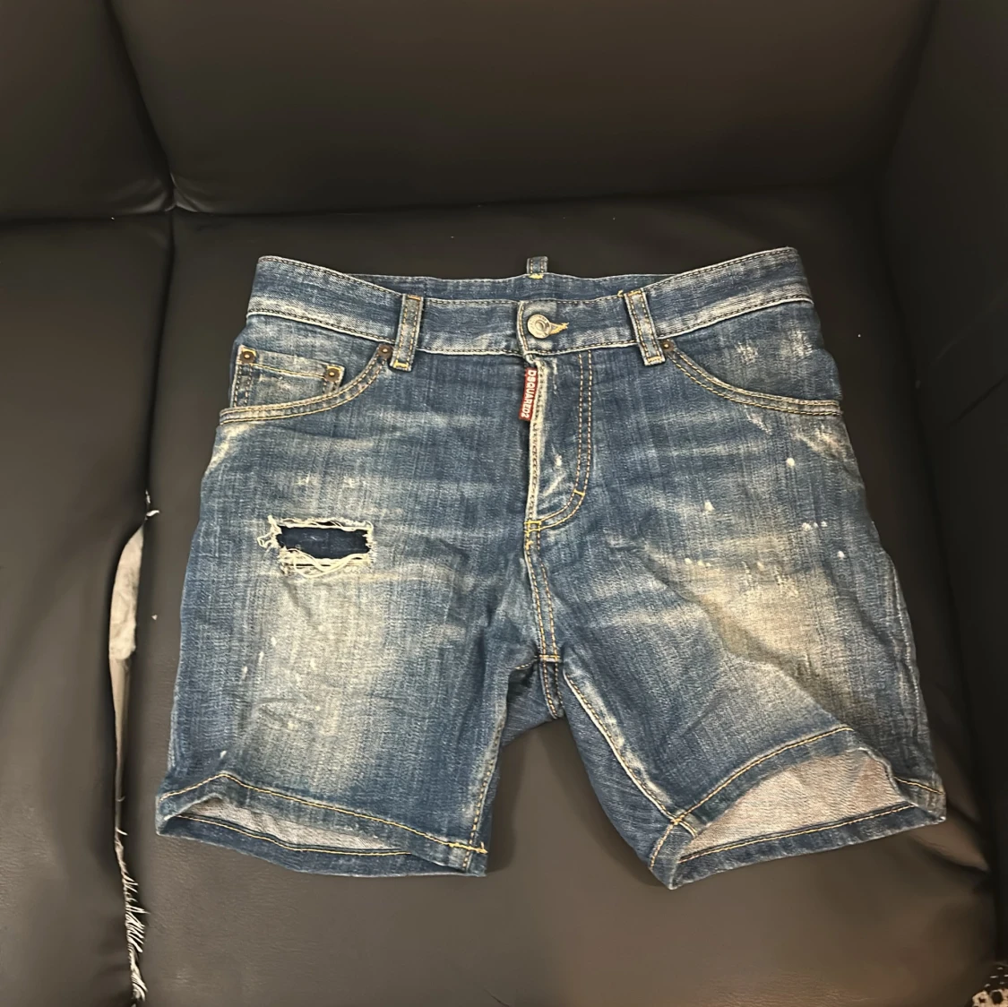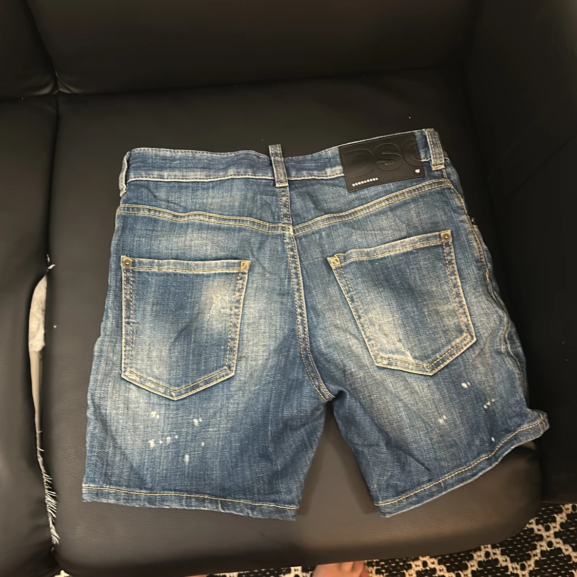 Säljer ett par snygga blå jeansshorts från Dsquared2. De har en cool slitning och en liten reva på framsidan som ger dem en avslappnad look. Shortsen har klassisk femficksdesign och en knappgylf. Perfekta för sommardagar!