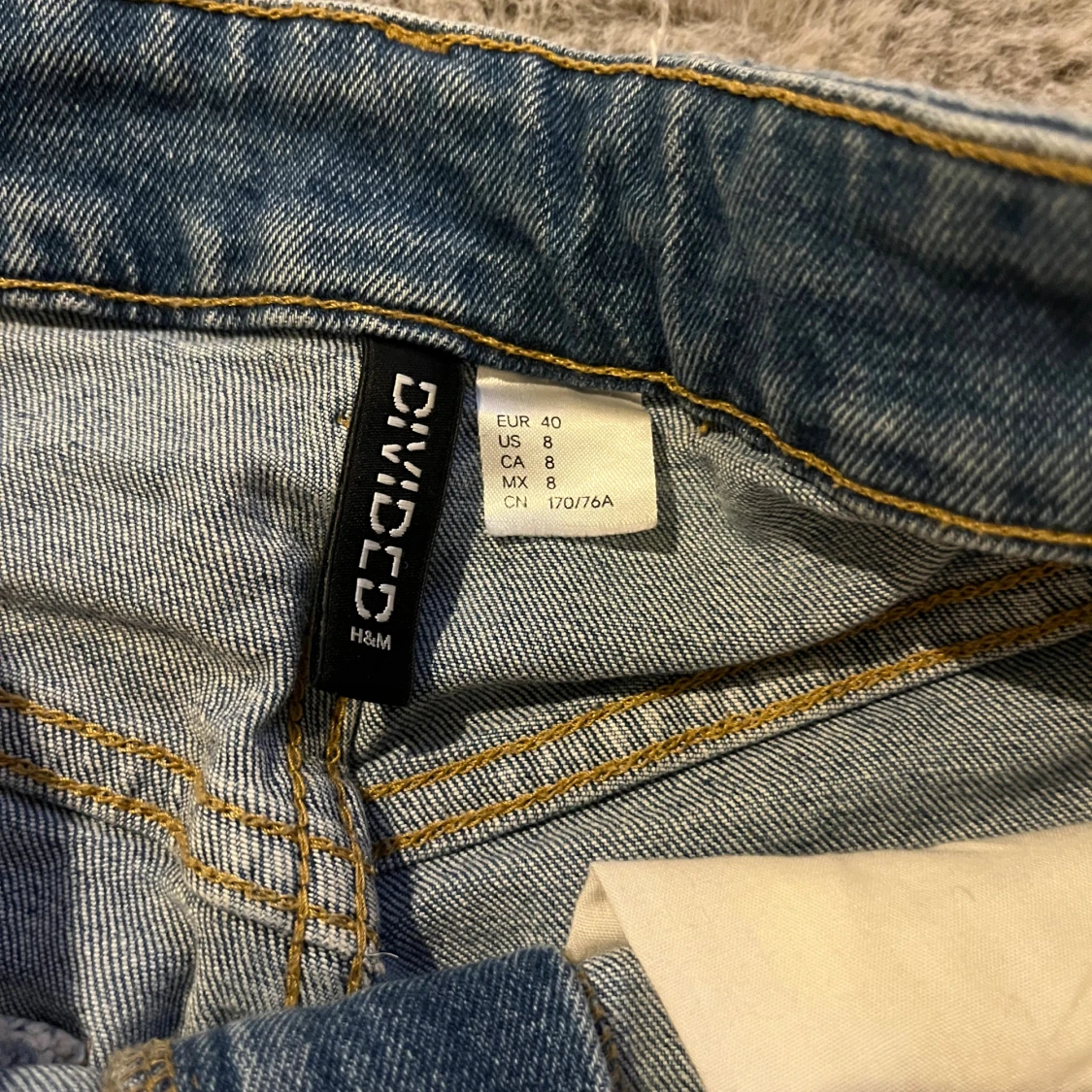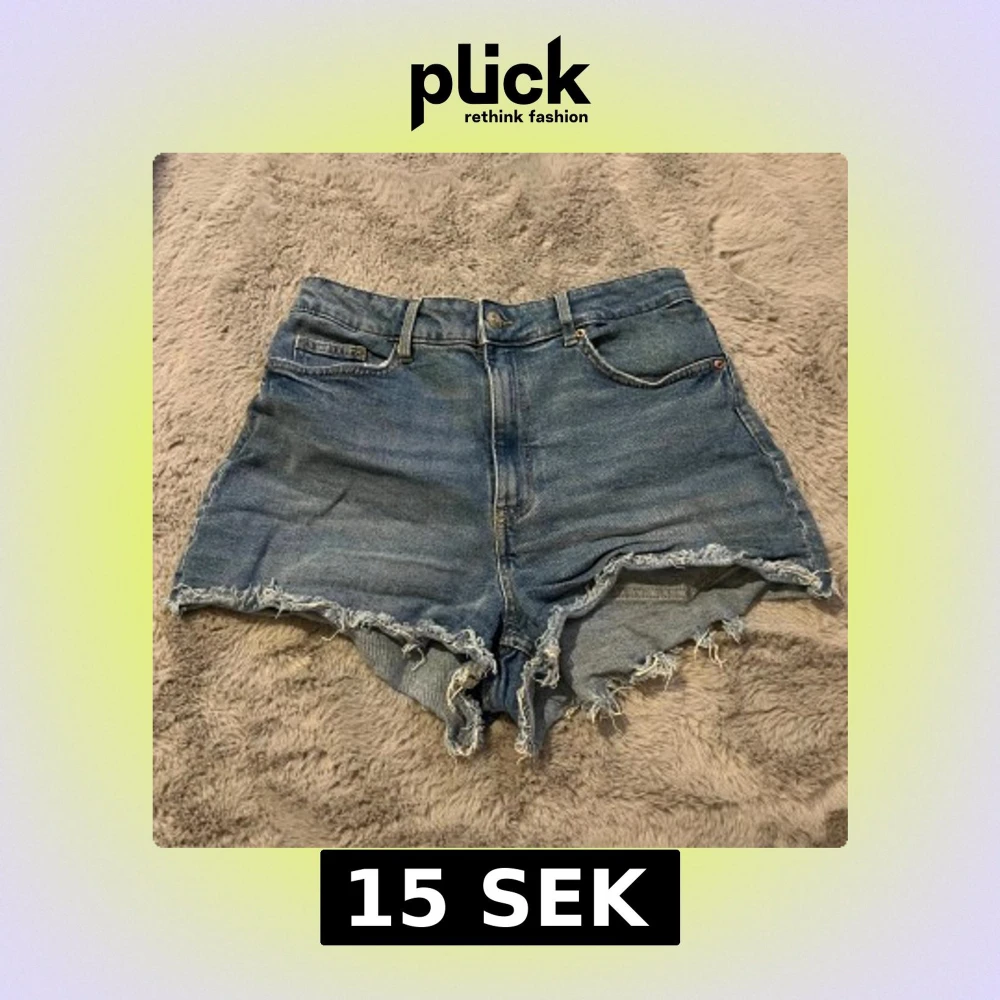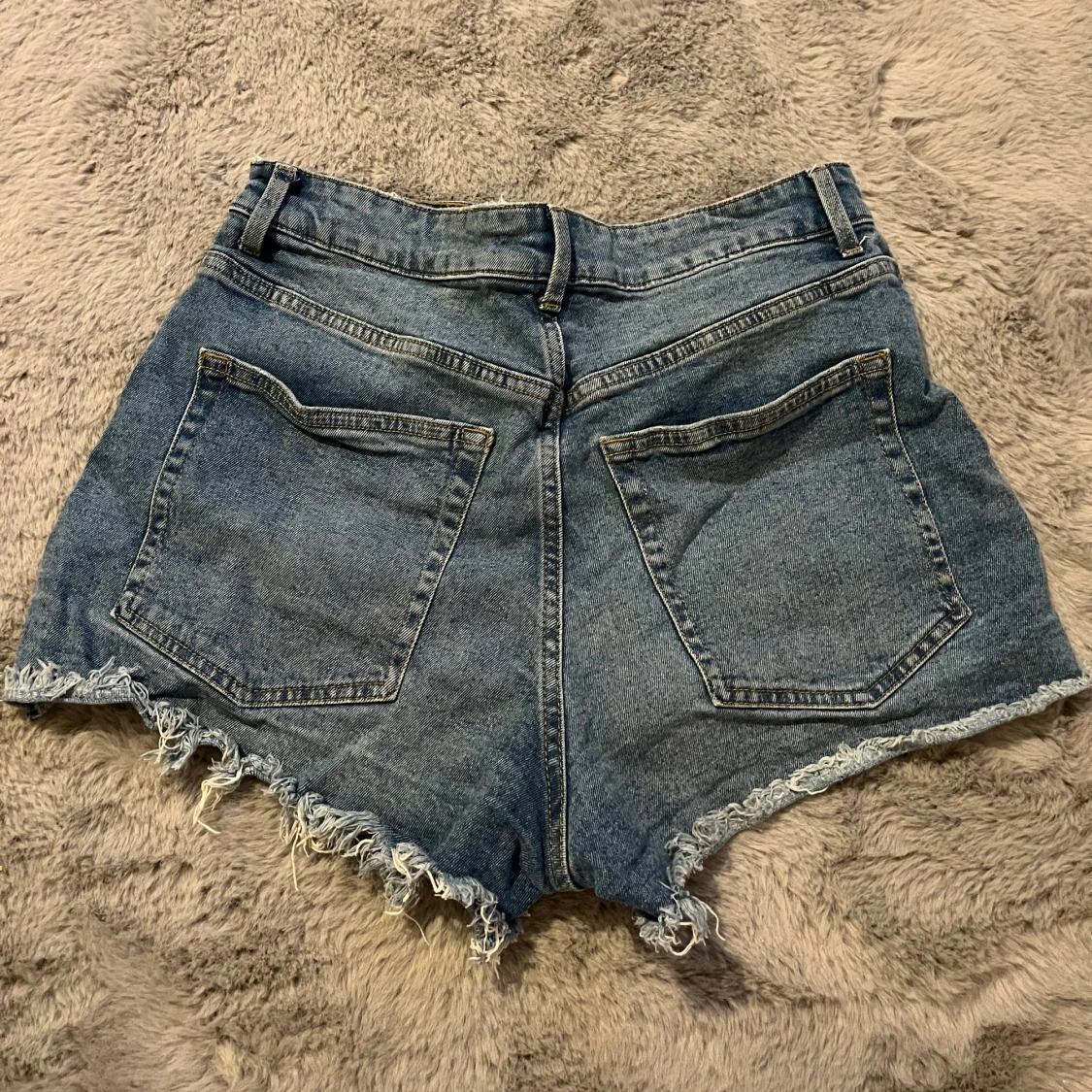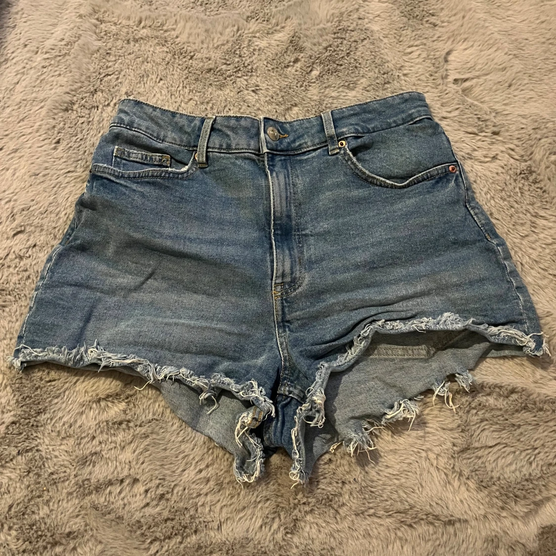 Säljer ett par blå jeansshorts från H&M Divided i storlek 40. De är högmidjade med råa, fransiga kanter och klassisk femficksdesign. Perfekta för varma dagar och har en avslappnad, loose fit. Gjorda i bomull för en skön känsla.