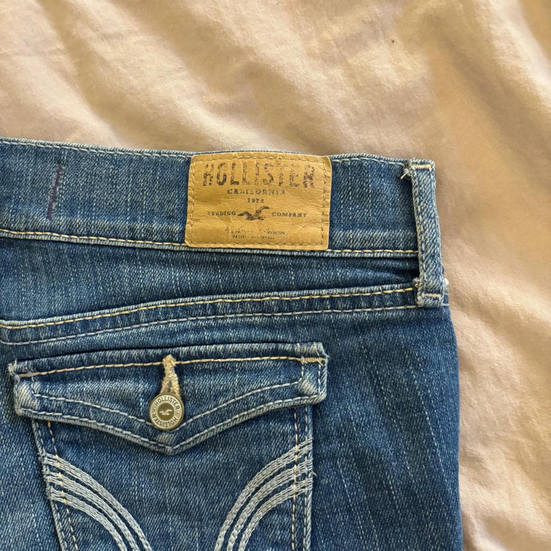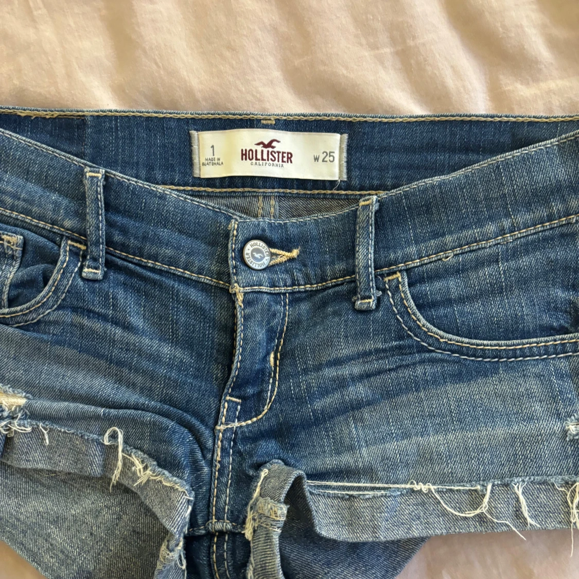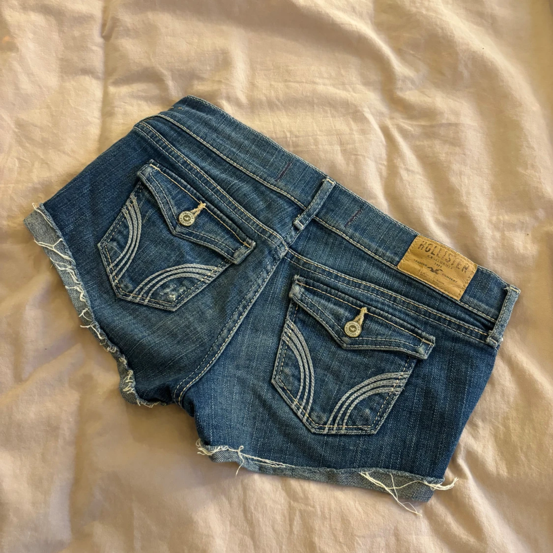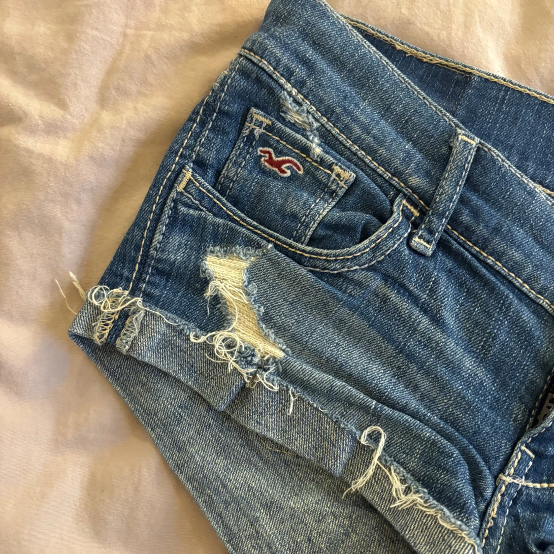 Säljer ett par blå jeansshorts från Hollister med låg midja. Shortsen har slitna detaljer, fransiga kanter och klassiska fickor både fram och bak. Har ingen bild med de på tyvärr!💘