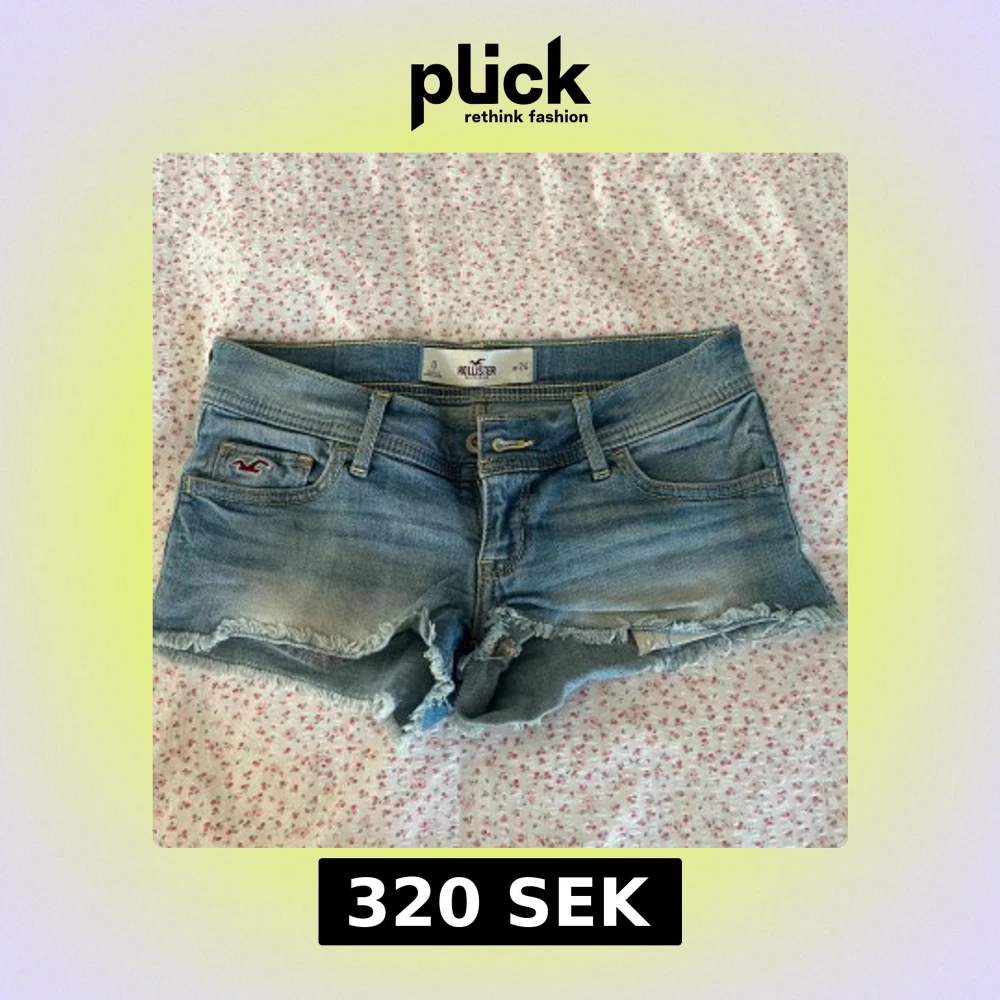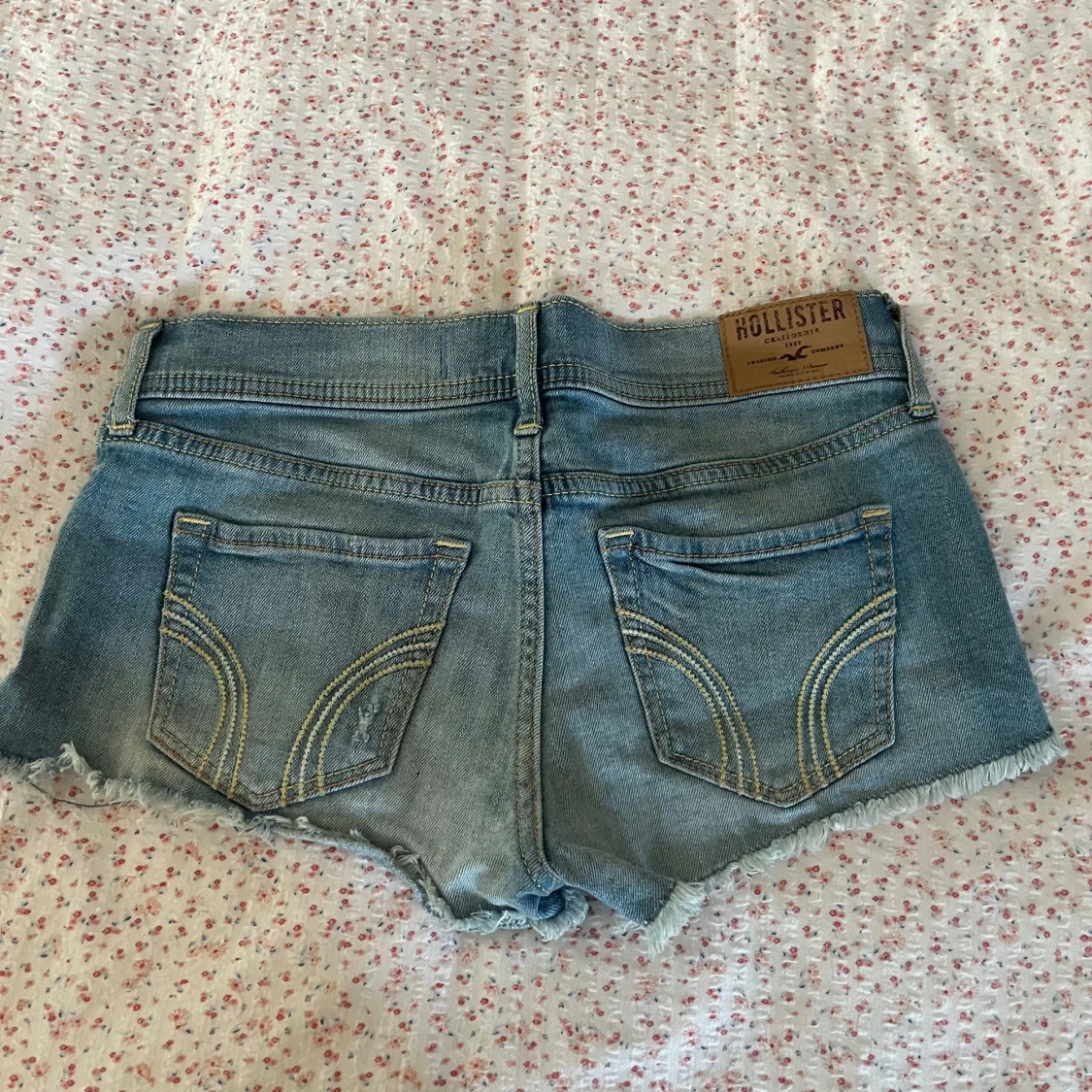 Snygga ljusblå jeansshorts från Hollister med fransig kant och klassisk femficksdesign. Shortsen har låg midja, slitna detaljer och Hollisters logga på fickan. Perfekta för varma sommardagar och en avslappnad look.