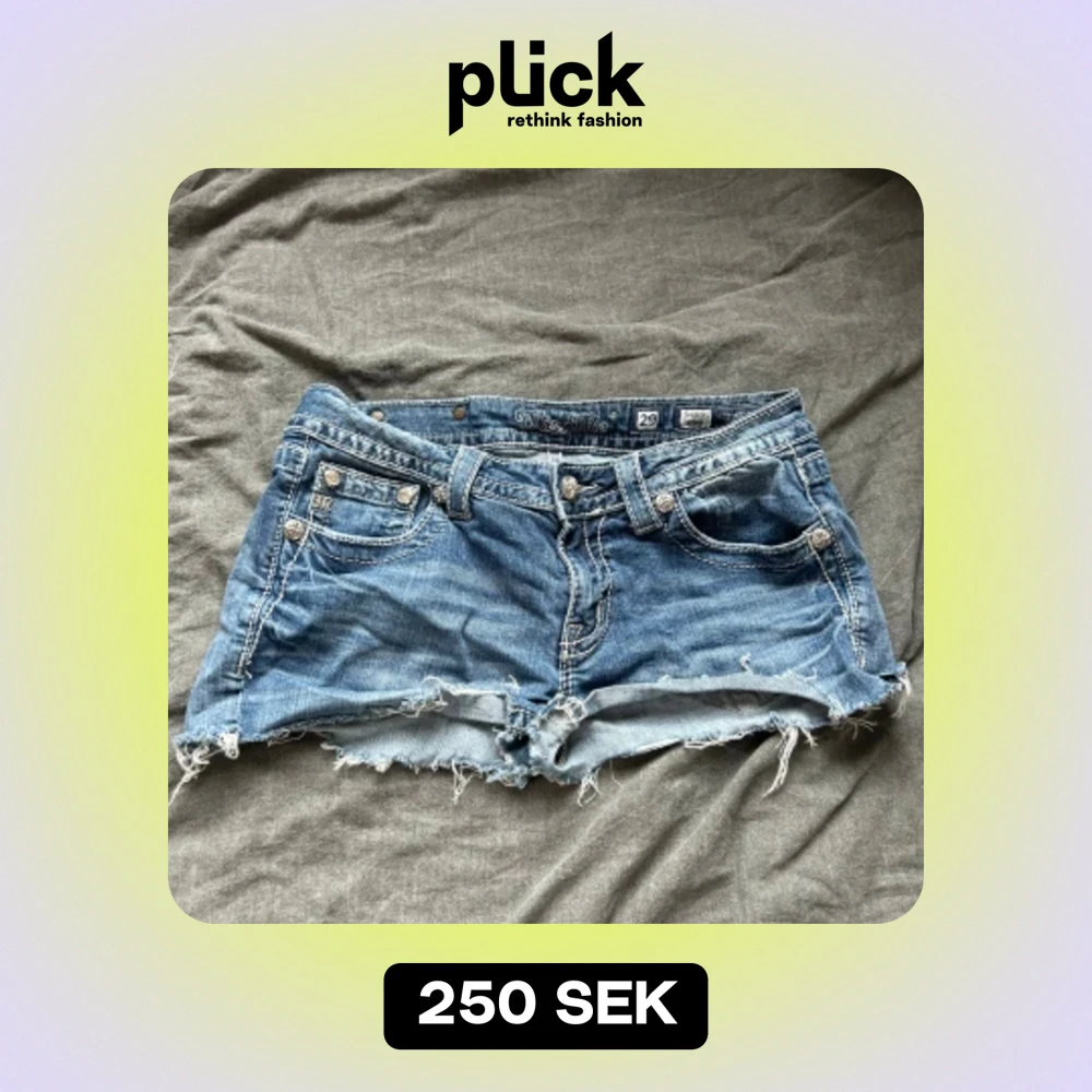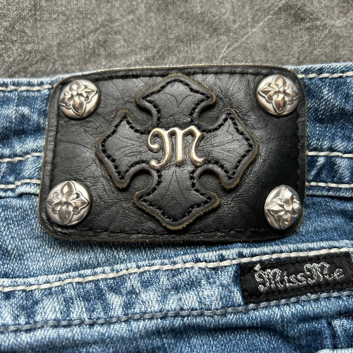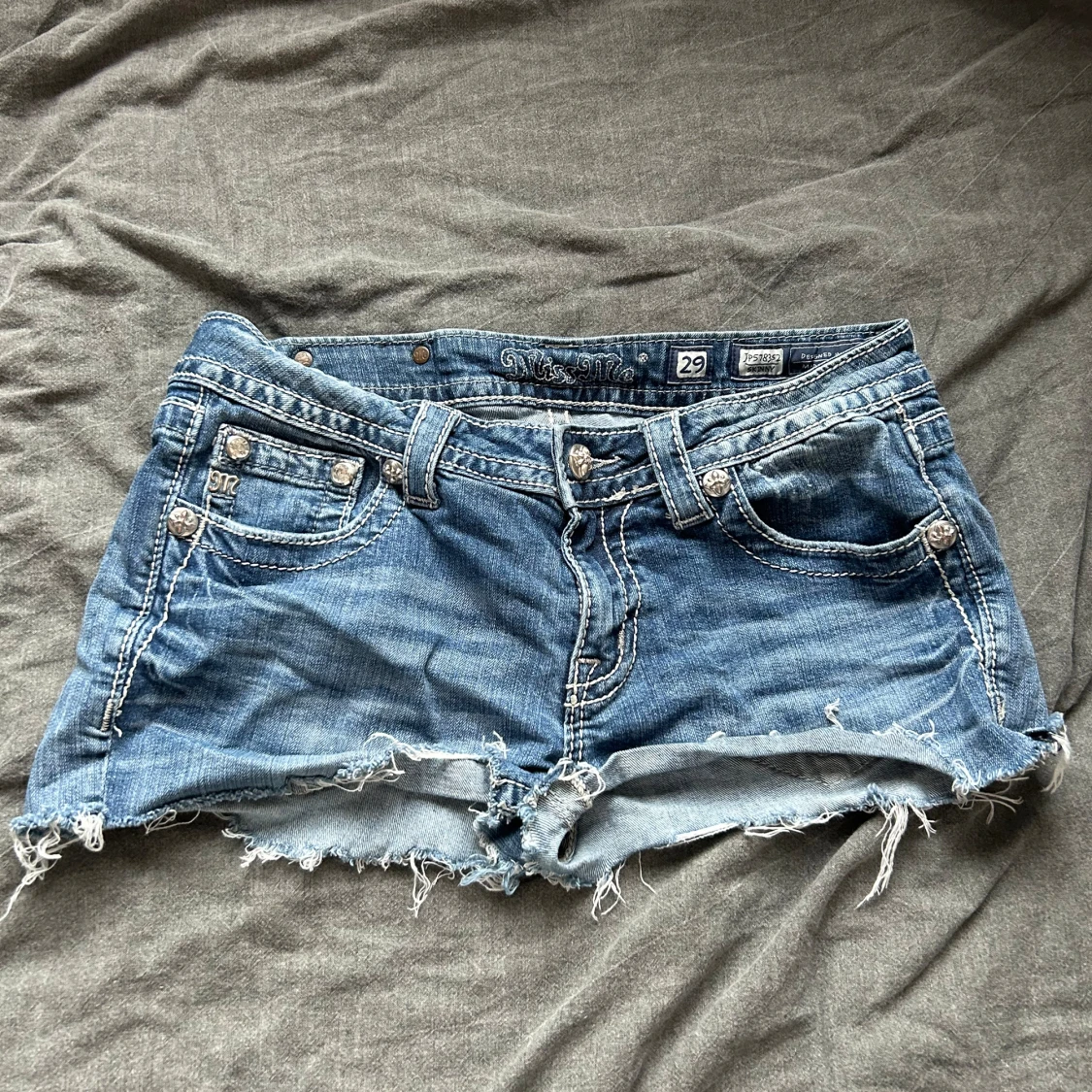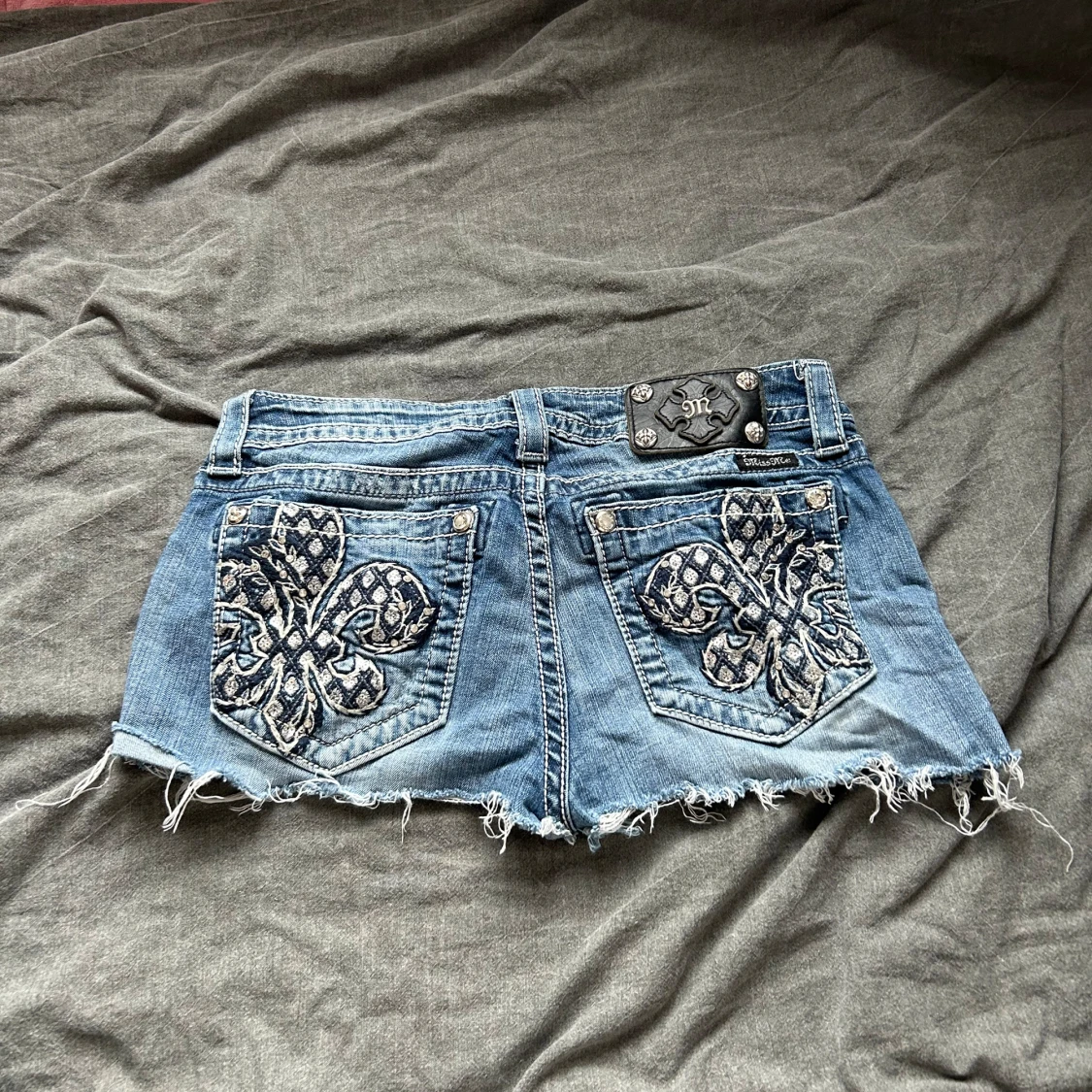 Ett par blå jeansshorts från Miss Me med slitna kanter och dekorativa broderade mönster på bakfickorna. Shortsen har flera fickor och knappar som detaljer.