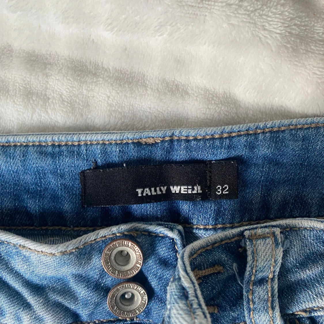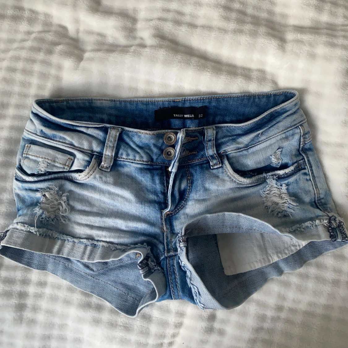 Snygga lågmidjade blå jeansshorts från Tally Weijl med slitna detaljer och perfekta för sommaren. Säljer eftersom att de är lite för små. Använda ca 5 gånger. Storlek 32 men skulle säga att de är XS.Hör av dig om du har några frågor. Pris kan diskuteras vid snabbt köp!🥰❤️