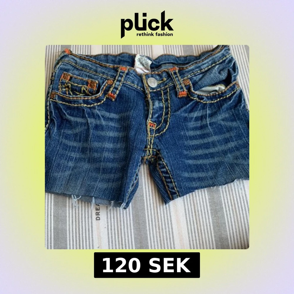 Säljer ett par coola blå jeansshorts från True Religion med snygga kontrastsömmar och slitna detaljer. Shortsen har klassisk femficksdesign och en knappgylf. Perfekta för en avslappnad stil!
