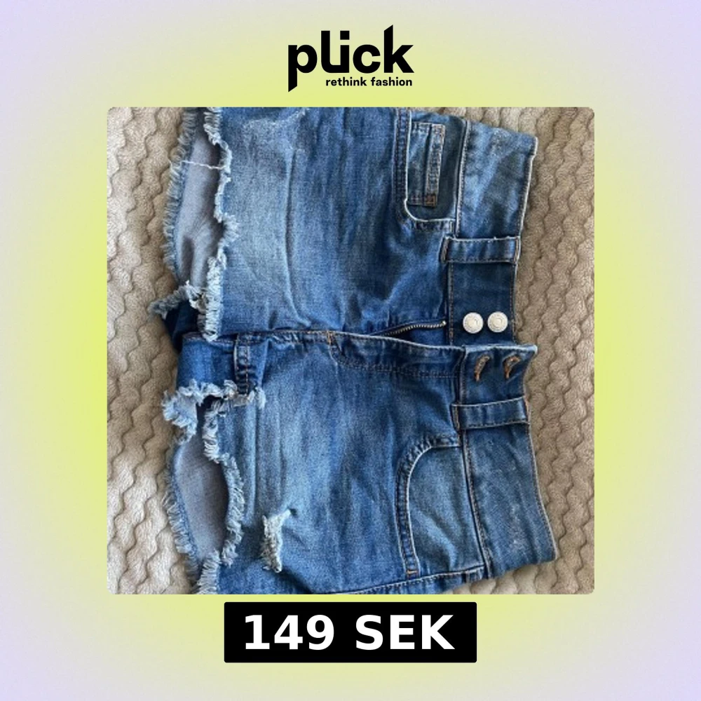 Snygga blå jeansshorts från H&M med fransig kant. Klassisk femficksmodell med dubbla knappar och dragkedja framtill. Perfekta för sommaren och ger en avslappnad vibe.