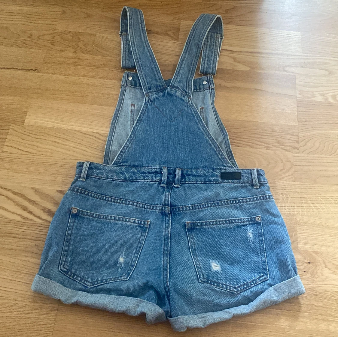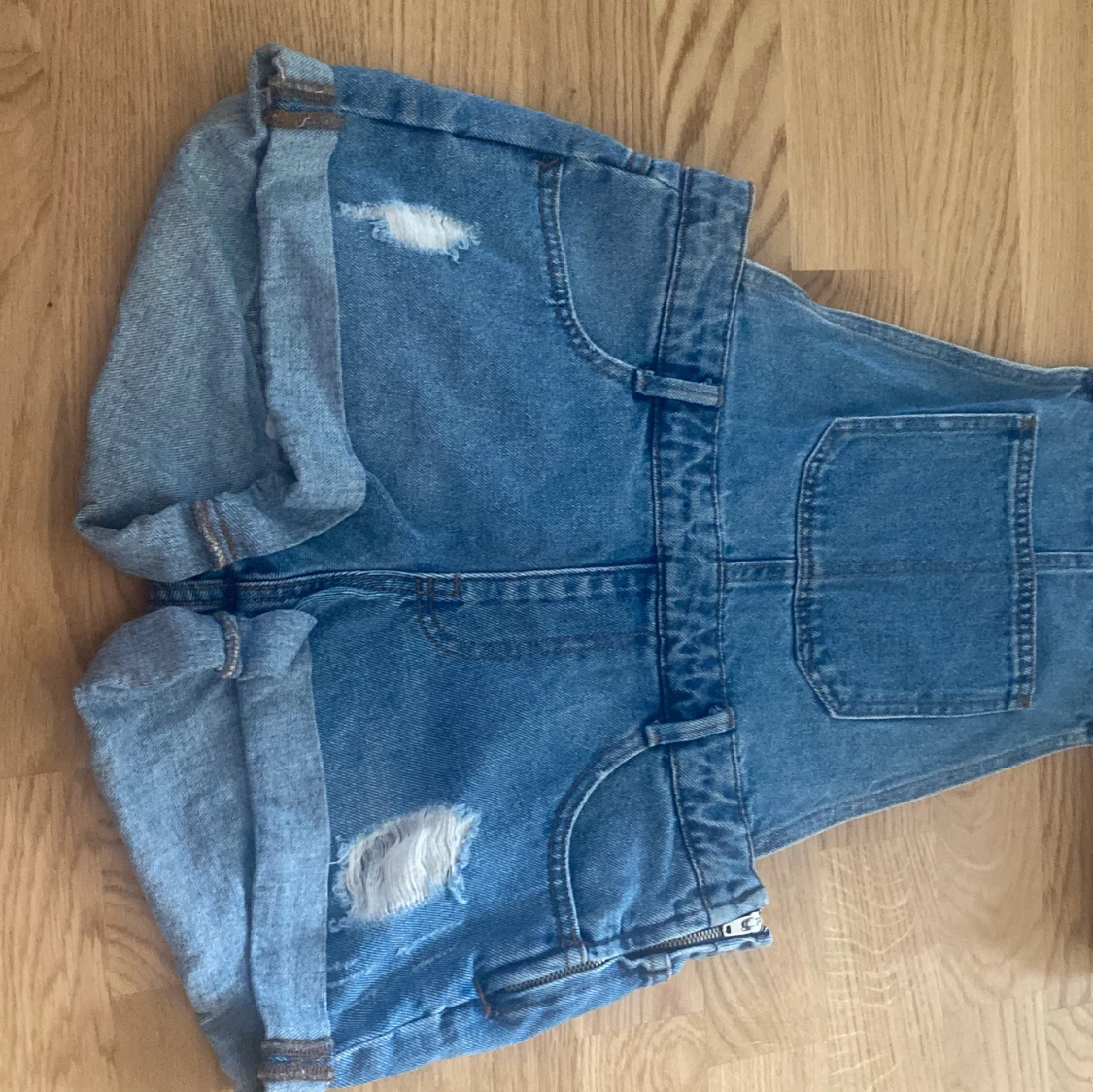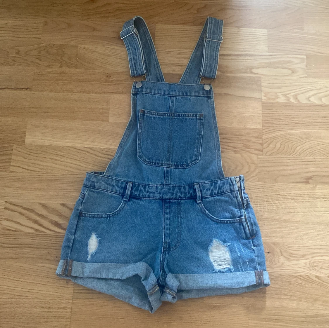 Snygga blå jeansshorts med hängslen och slitna detaljer. Klassisk femficksmodell med uppvikta benslut och stor bröstficka framtill. Perfekt för en chill sommarlook. Justerbara axelband och dragkedja i sidan för enkel påtagning.