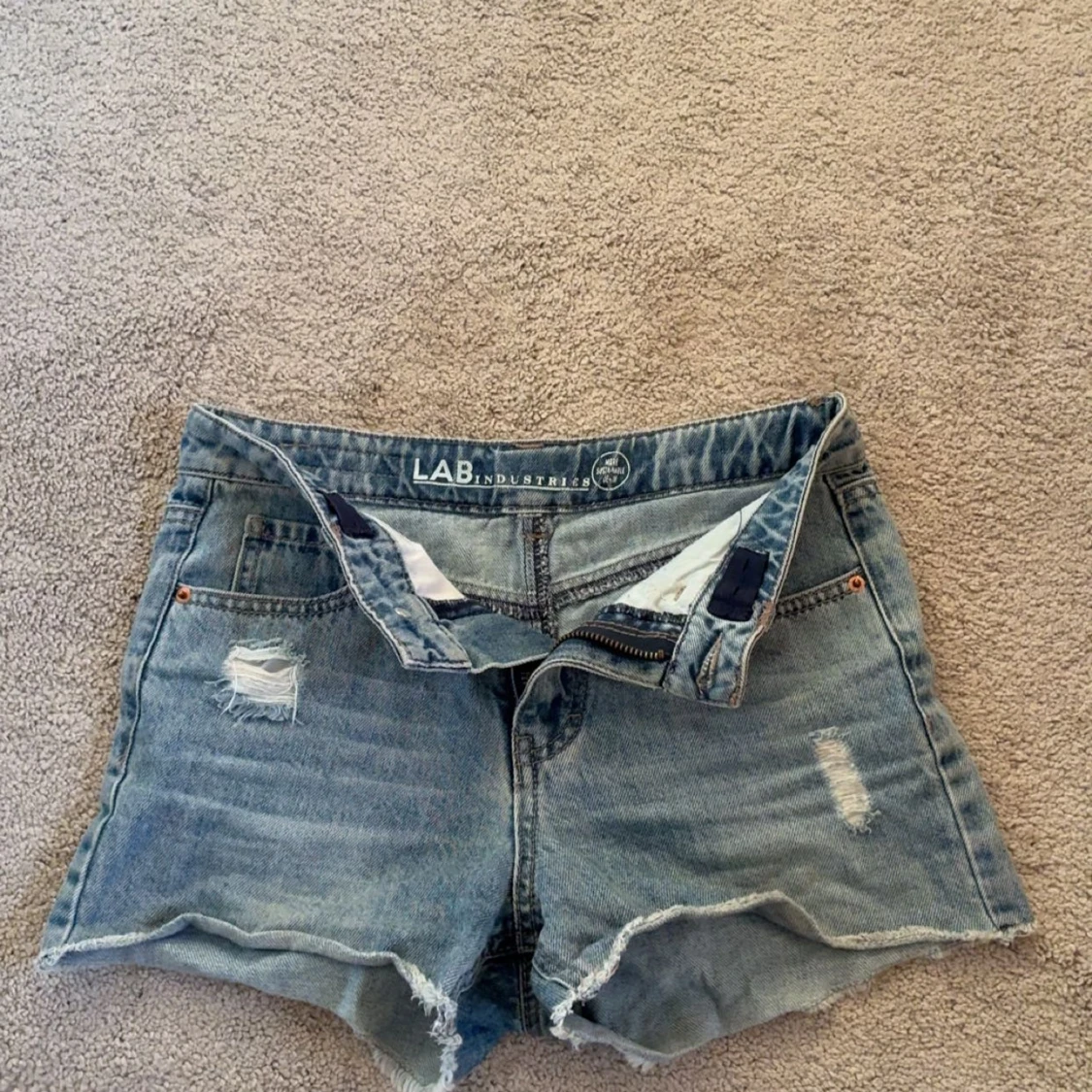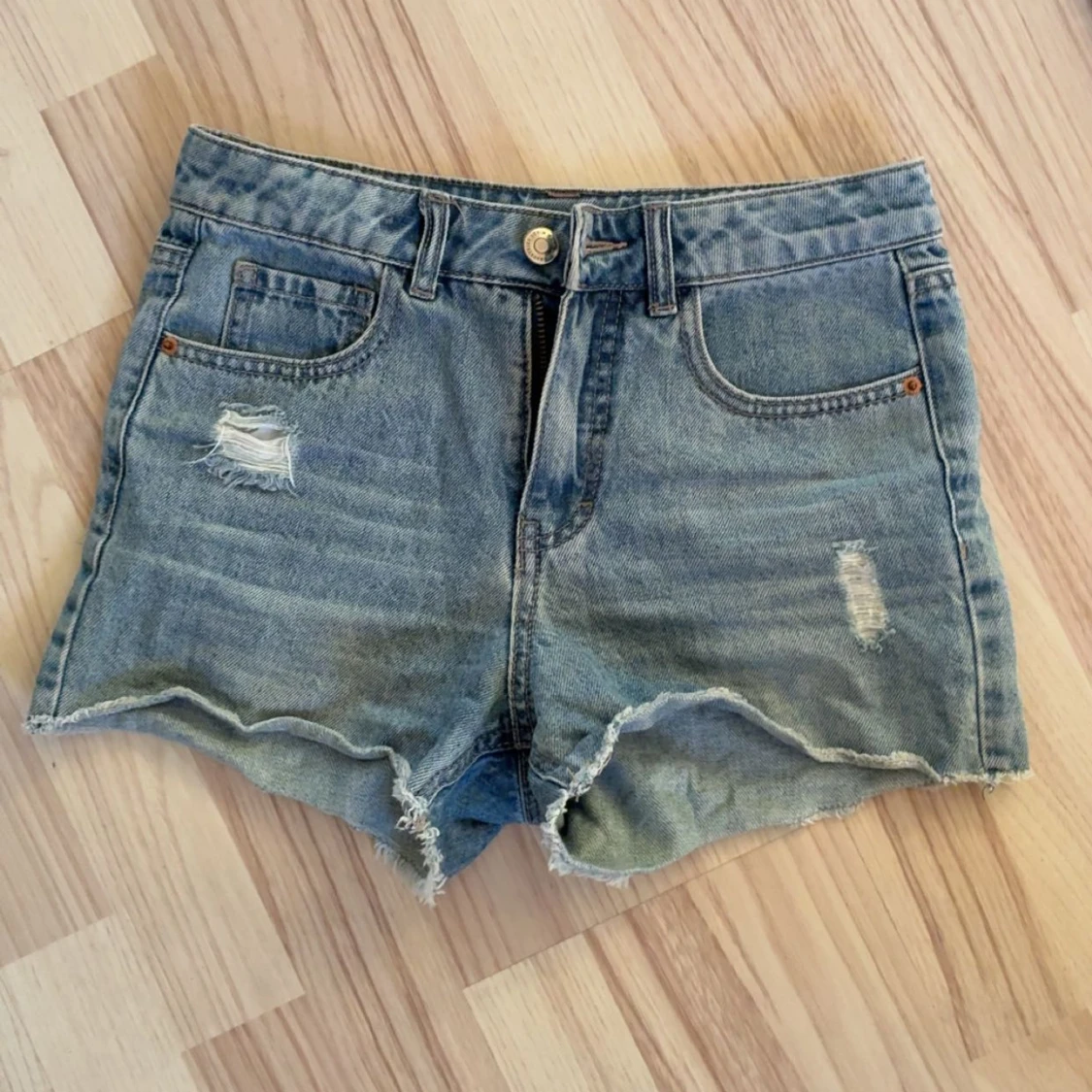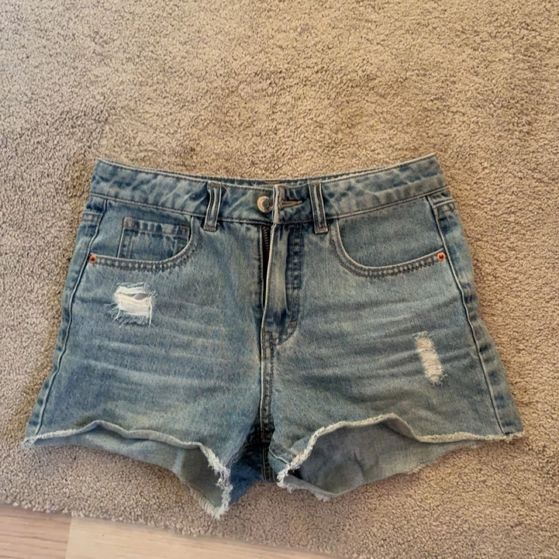 Snygga blå jeansshorts med fransig kant och slitna detaljer framtill. Klassisk femficksmodell med knapp och dragkedja. Perfekt för dig som gillar en chill och avslappnad stil❣️