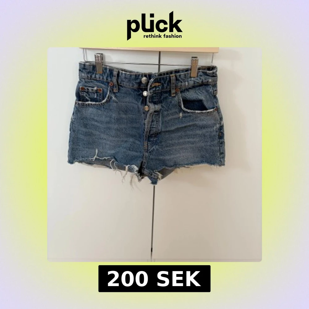 Säljer ett par klassiska blå jeansshorts med råa franskantade benslut och låg midja. Shortsen har fem fickor, knappgylf och en avslappnad passform. Perfekta för sommardagar