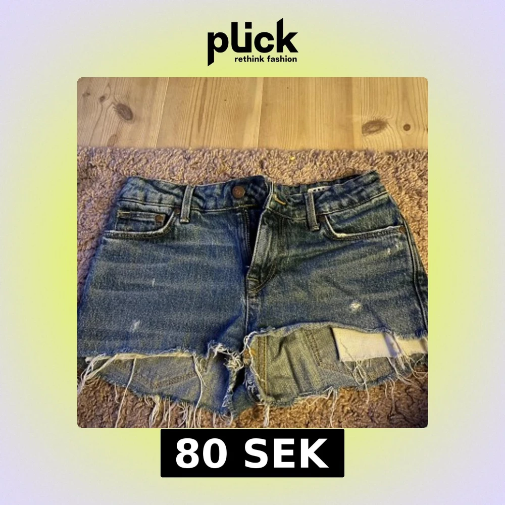 Säljer ett par klassiska blå jeansshorts från ONLY med råa fransade kanter och slitna detaljer. Shortsen har fem fickor, knapp och dragkedja framtill samt bälteshällor. Perfekta för sommaren! Midjemått rakt över är 34cm