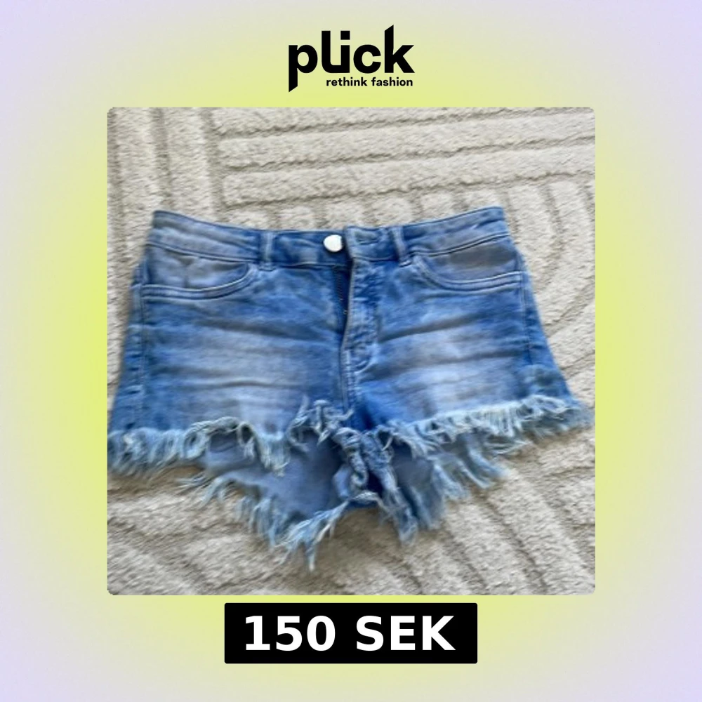 Säljer ett par blå jeansshorts med snyggt fransig kant och klassisk femficksmodell. Shortsen har en ljus tvätt och råa kanter som ger en cool, avslappnad vibe. Perfekta för varma dagar och festivalhäng.