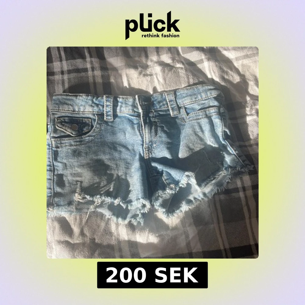 Snygga ljusblå jeansshorts med fransig och sliten kant. Klassisk femficksmodell med bälteshällor och knappar på bakfickorna. Perfekta för varma dagar och ger en avslappnad vibe.