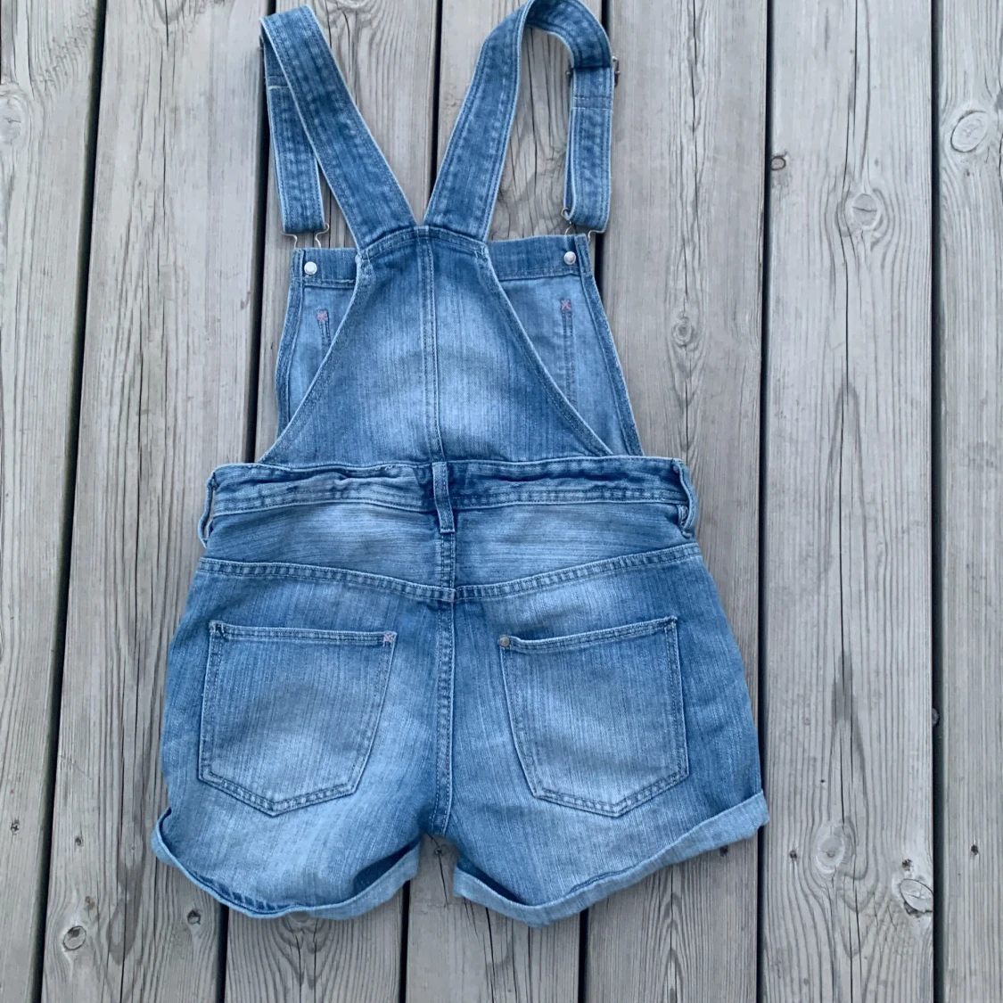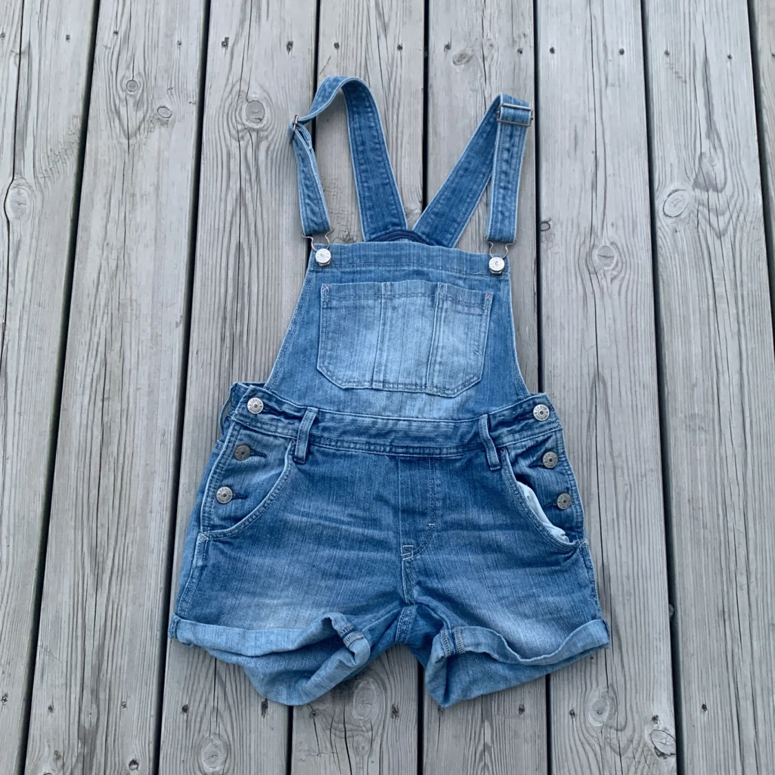 Snygga blå jeansshorts med hängslen från H&M. Modellen har klassisk bib framtill, stora fickor och knappar på sidorna. Jag säljer dem då de tyvärr blivit försmå för mig.