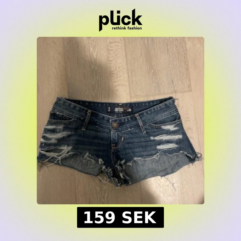 Snygga blå jeansshorts från hollister med coola slitningar och fransiga kanter. Perfekta för en avslappnad stil. De har en knapp och dragkedja framtill samt klassiska bakfickor med dekorativa sömmar. Jag har sytt om de till lågmidjade de kan därför vara små i storleken då jag flyttat ner midjebandet.