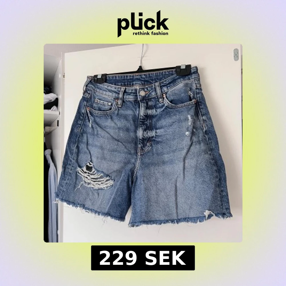 Säljer ett par coola blå jeansshorts från H&M med slitningar och fransiga kanter. Shortsen har en hög midja och klassisk femficksdesign. Perfekta för en avslappnad stil. Använda ca 5 gånger. Önskar du veta exakta mått? Tveka inte att höra av dig!