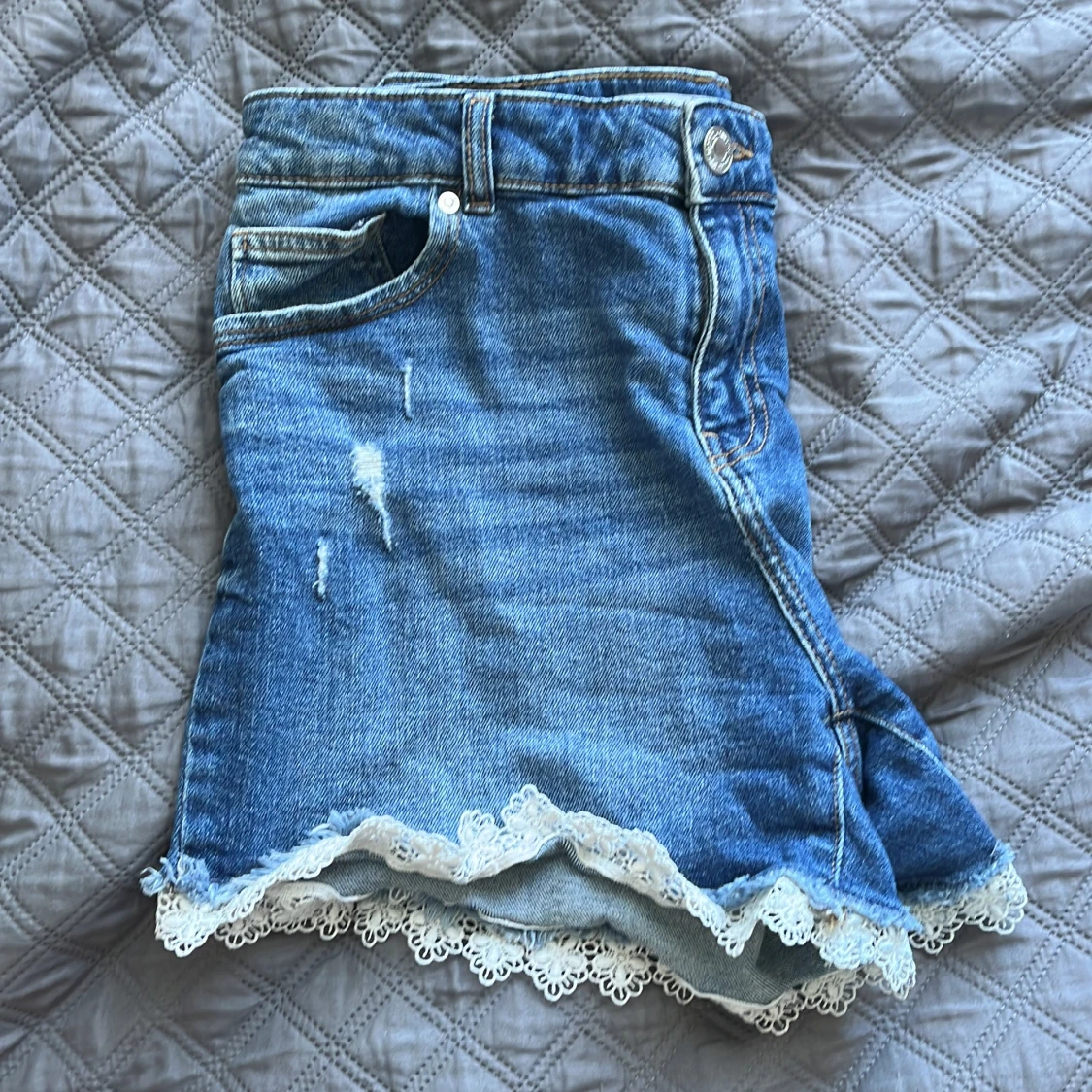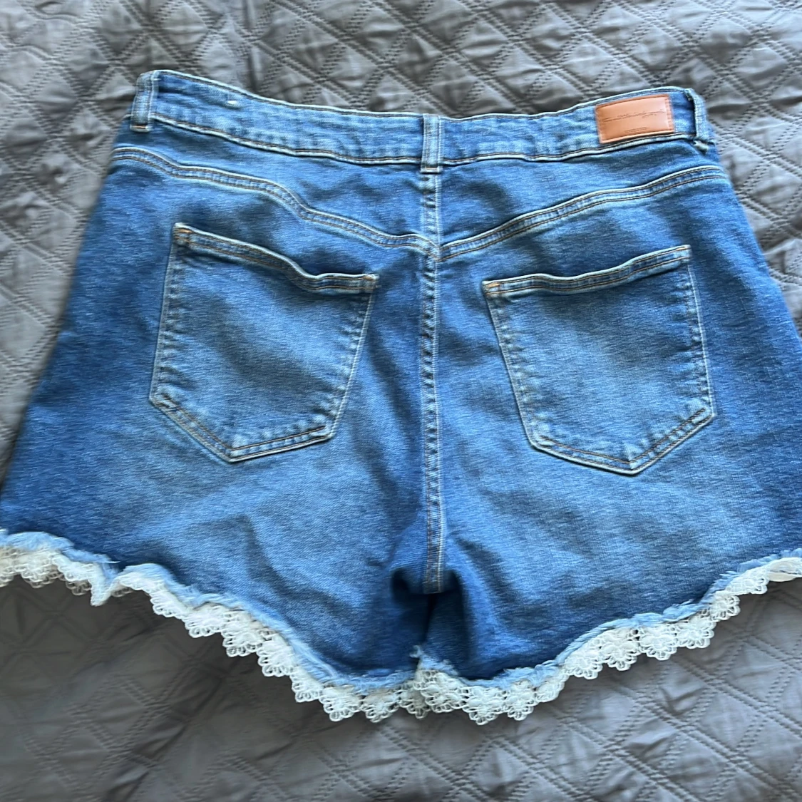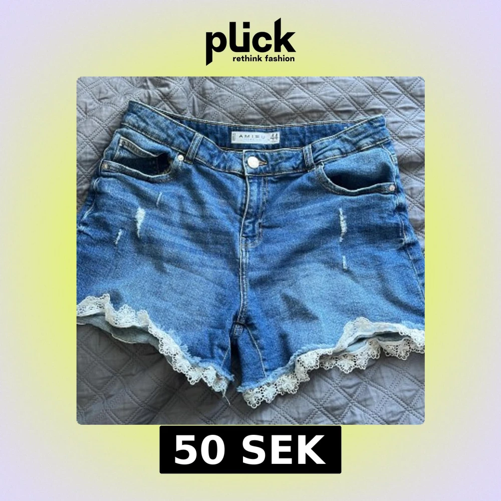 Snygga blå jeansshorts från Amisu med ljusa slitningar och vit spetskant längst ner. Klassisk femficksmodell med knapp och dragkedja framtill. Perfekta för sommaren när du vill ha en chill men ändå söt look.