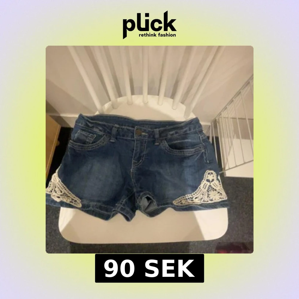 Snygga blå jeansshorts med spetsdetaljer på sidorna. Perfekta för en avslappnad sommarlook. De har en klassisk femficksdesign och knappgylf. Lågmidjade med perfekt längd