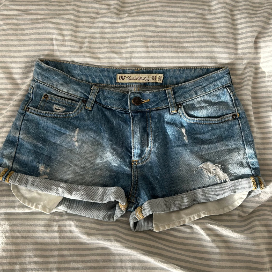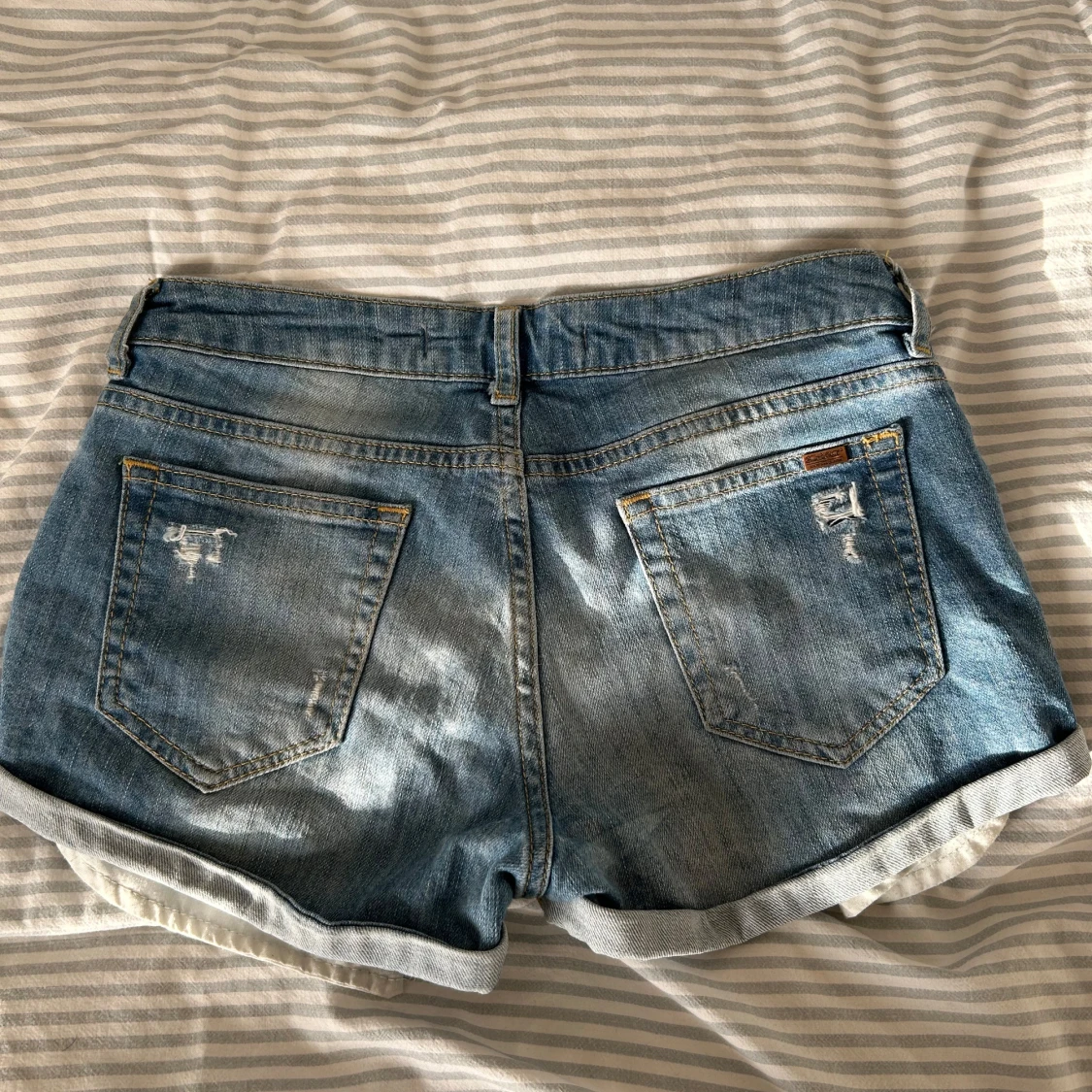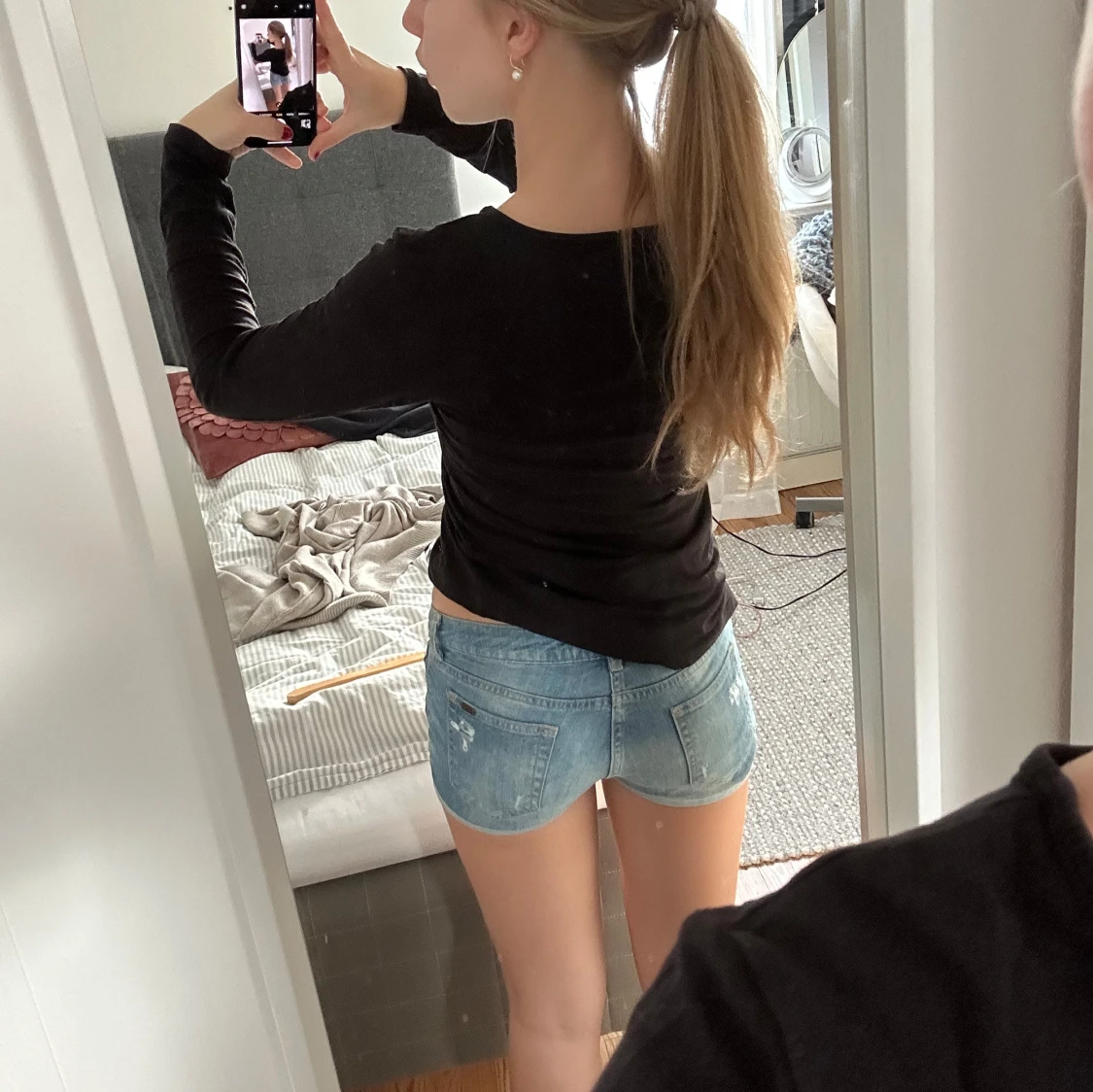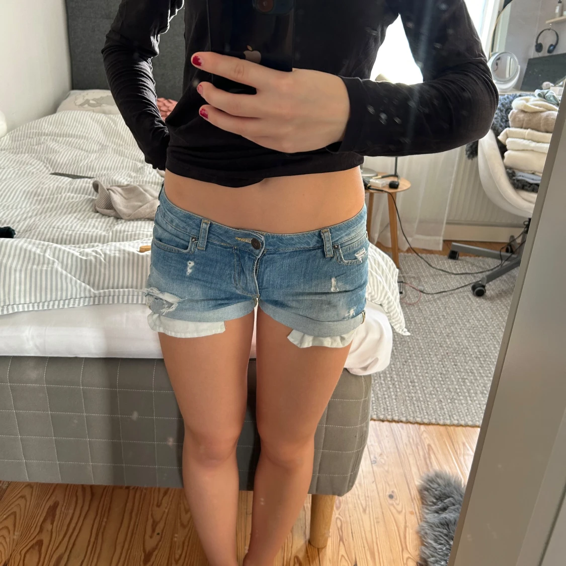 Snygga blå jeansshorts med låg midja!💙 Köpta på Loppis för några år sedan. Säljer då de är lite små för mig. Knappen sitter lite löst men det är lätt fixat! Midja tvärs över:36cm