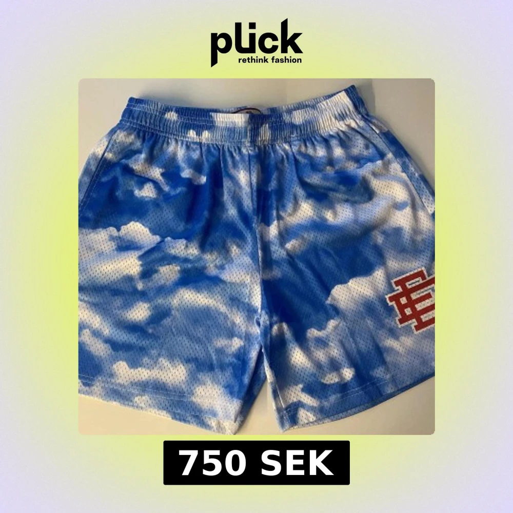 Snygga meshshorts med blått och vitt molnmönster och röd EE-logga på ena benet. Shortsen har elastisk midja och är perfekta för en chill och sportig look. Lätta och luftiga, passar grymt till sommaren.