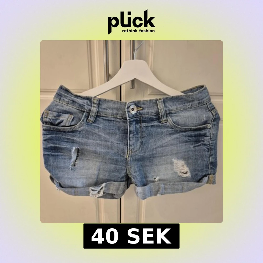 Snygga blå jeansshorts från Lindex med slitna detaljer och upprullade benslut. Klassisk femficksmodell med knapp och dragkedja framtill. Perfekta för varma dagar när du vill ha en avslappnad och trendig look. Det vänstra hålet ska egentligen se ut som de högra bara att de vita trådarna är borta.