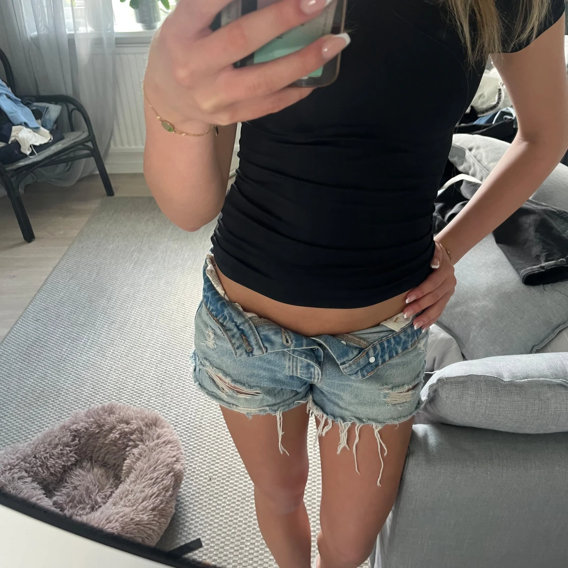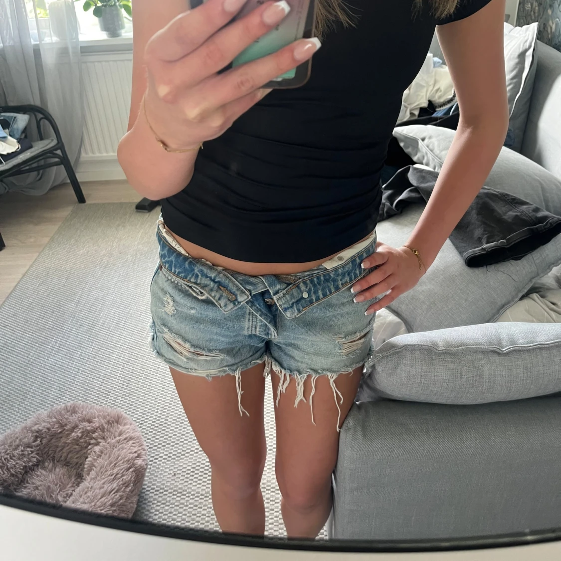 Säljer ett par blå jeansshorts med låg midja och råa, fransiga kanter. Shortsen har slitningar och hål på framsidan för en riktigt chill och edgy vibe. Klassisk femficksmodell med knapp och dragkedja framtill. Perfekta för varma dagar och festivalhäng.