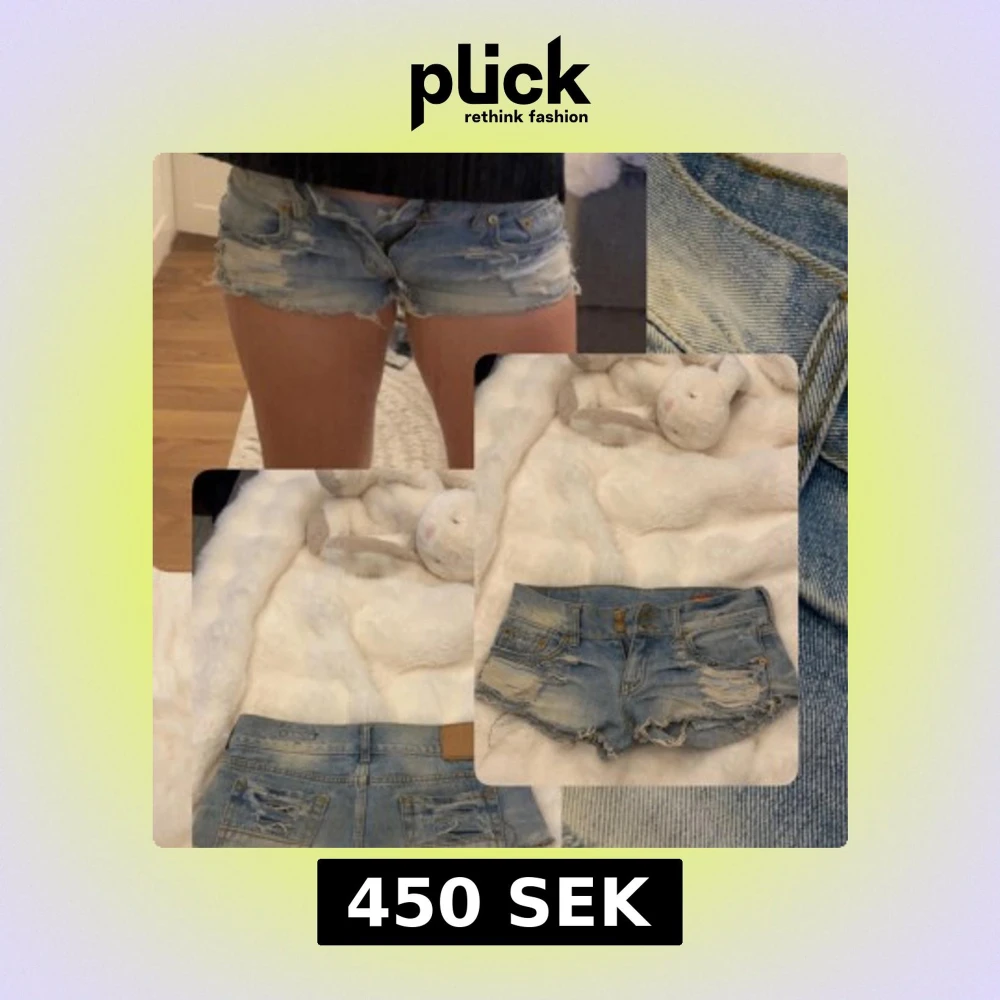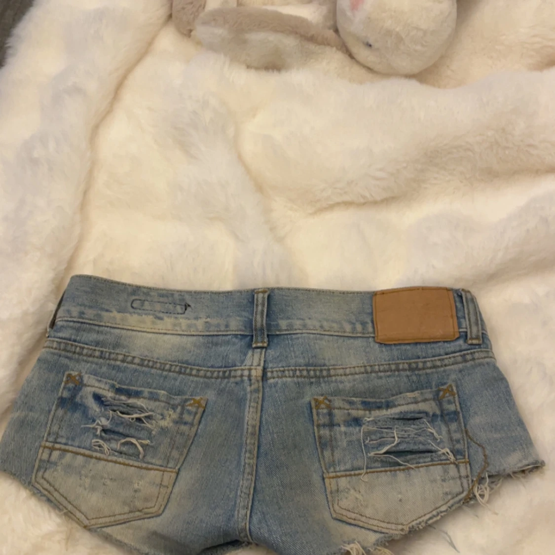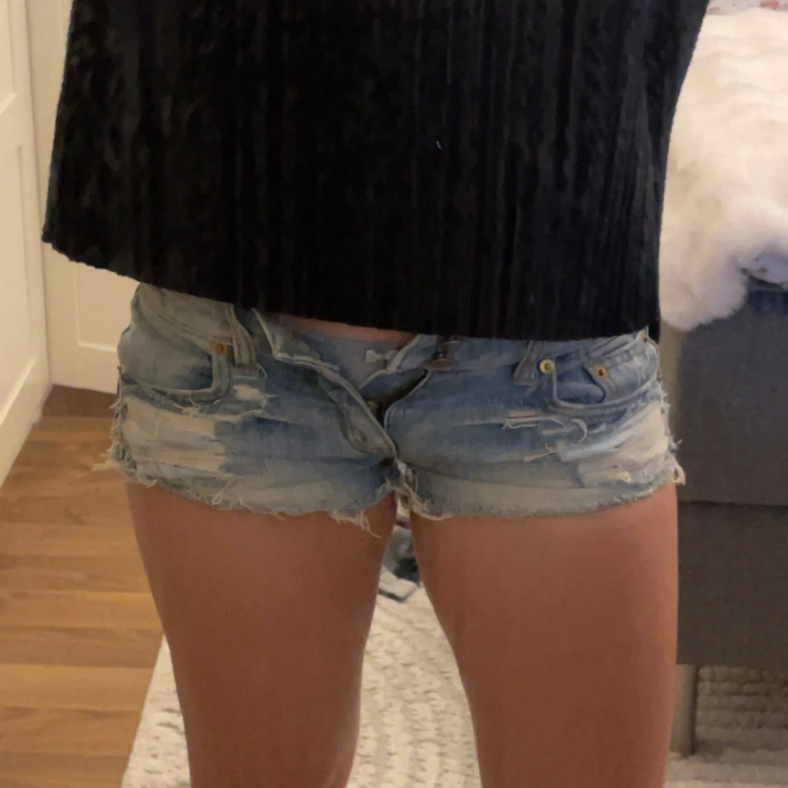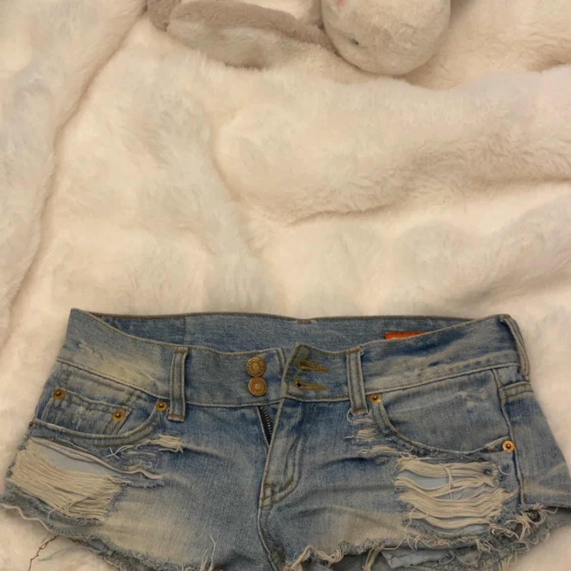 Säljer ett par ljusblå jeansshorts med låg midja och råa, fransiga kanter. Shortsen har slitna detaljer både fram och bak, dubbla knappar i midjan och klassiska fickor. Perfekta för sommaren och ger en cool, avslappnad vibe.
